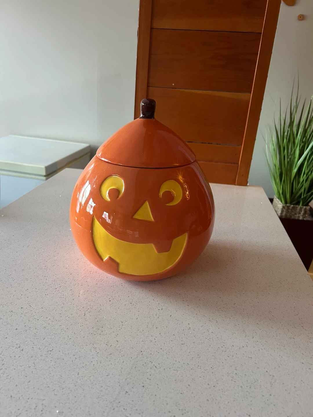 This festive ceramic jar is shaped like a pumpkin and comes with a lid. It's perfect for storing Halloween treats or as a seasonal decoration. It's made of ceramic material.