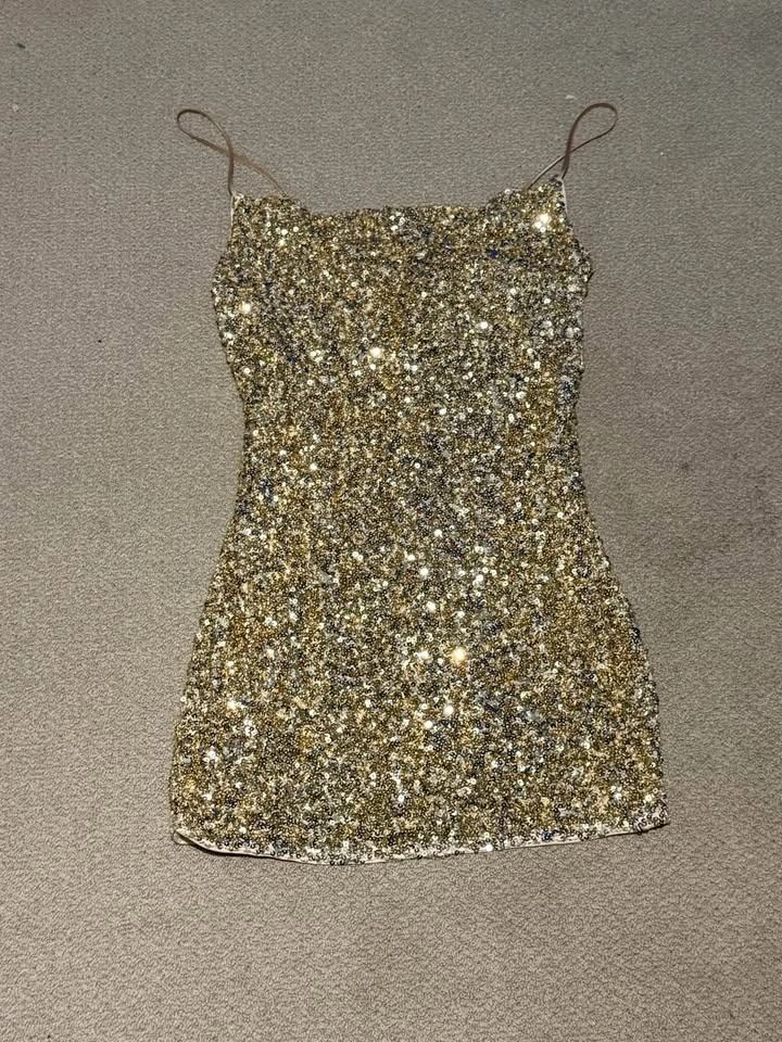 Gorgeous Dani Sequins Dress from Dynamite in the gold “Sandshell” color. Worn once to the Eras tour, in excellent condition. Super flattering slip-style fit. Perfect for New Year’s Eve, holiday parties, birthdays, or bachelorettes. Pickup in Abbotsford – Mount Lehman area.