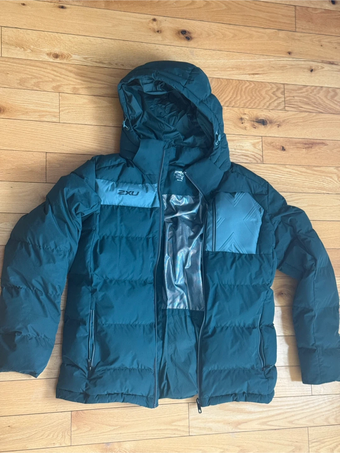 This is a 2XU down puffer jacket in a dark teal colour. It's a hooded winter coat designed for warmth. It has zippered pockets and a full front zip. Worn one or two times only. Size M. Men’s.