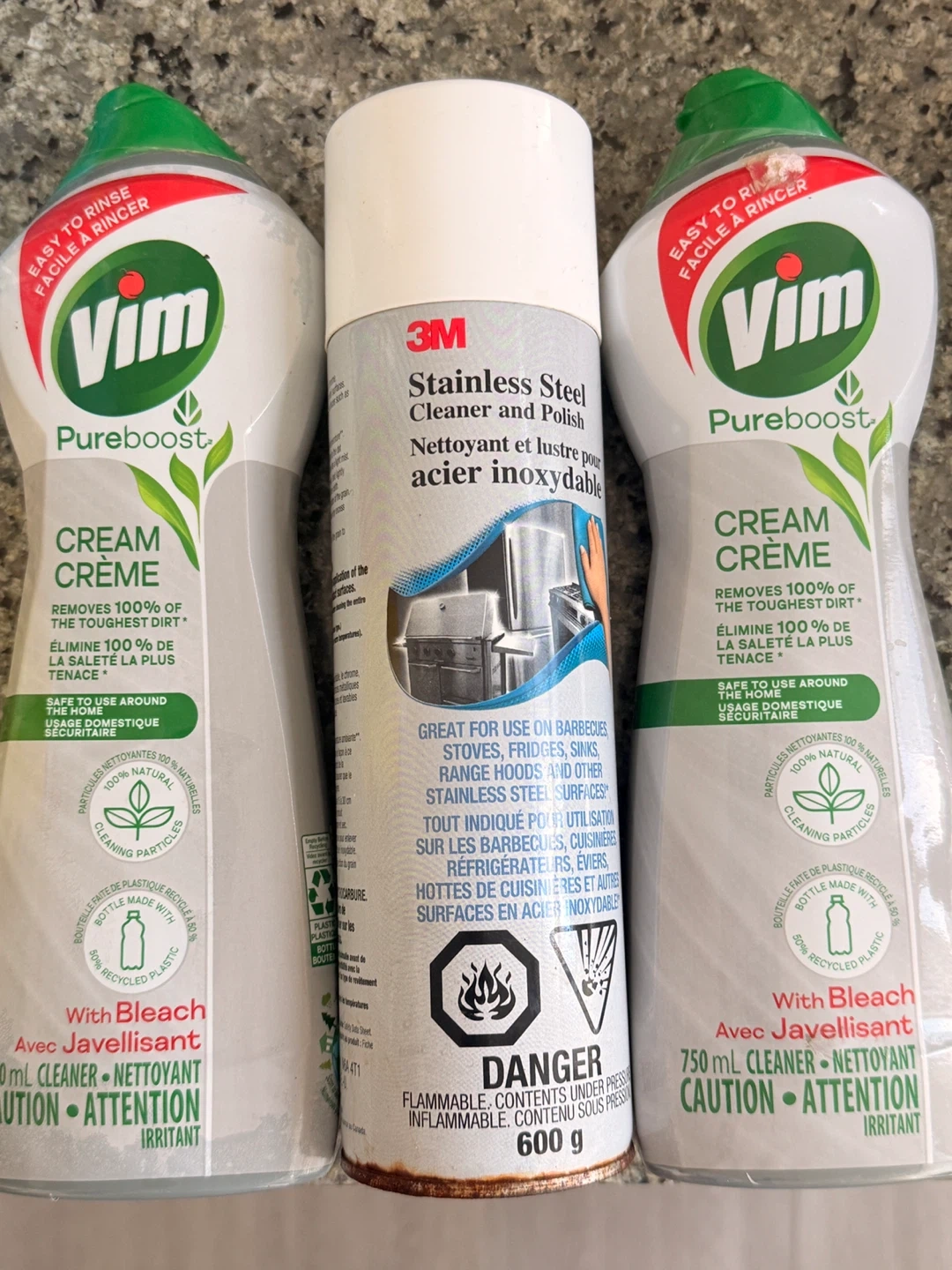 Two bottles of Vim Pureboost Cream Crème with bleach. Also includes one can of 3M Stainless Steel Cleaner and Polish. The Vim cleaners are 750 mL each, and the 3M cleaner is 600 g. Perfect for tackling tough grime on various surfaces!