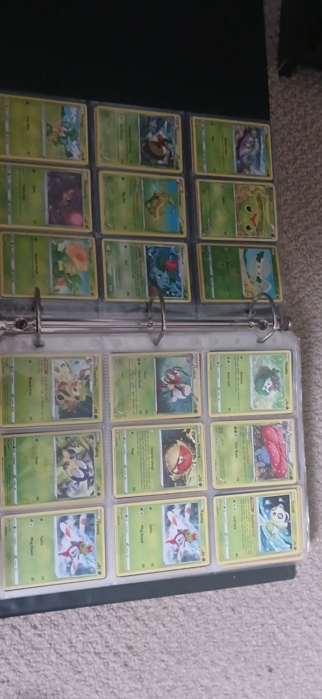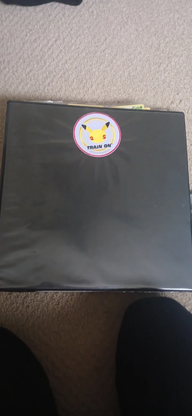 This is a Pokémon card binder full of various cards. It's a black binder with a "Train On" sticker on the front. Holds many cards!