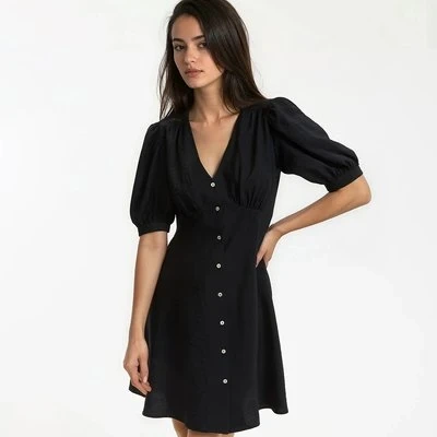 This is a black puff sleeve dress from GAP. It features a button-front closure and short, puffed sleeves. The fabric is lightweight and suitable for warmer weather. Size is XS. Linen blend