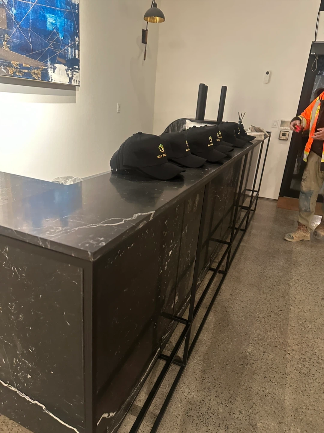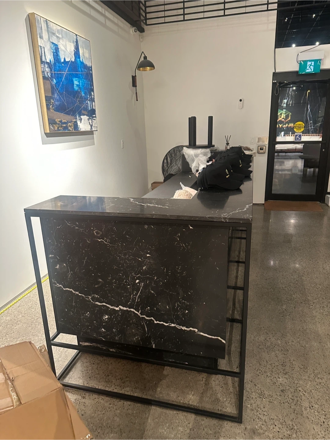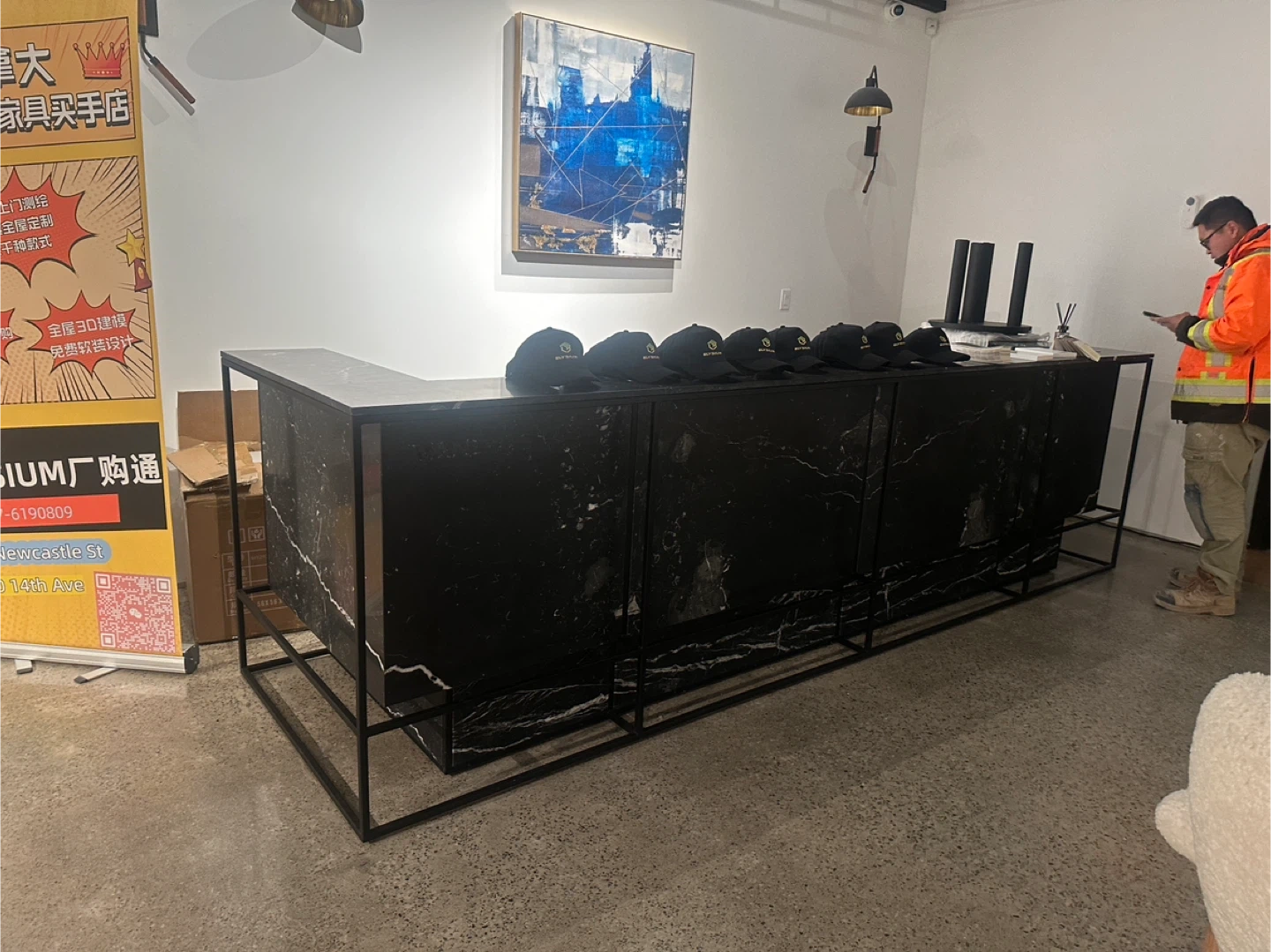 Reception desk with stone surface, 150 × 45 × 45 cm, suitable for high-end commercial spaces.