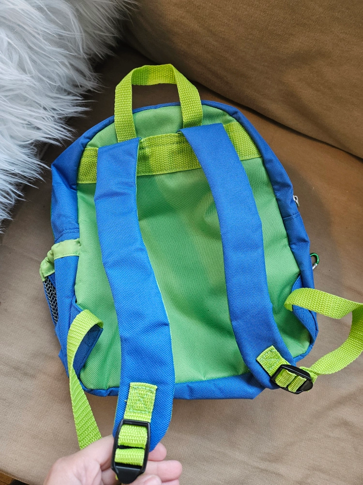 Cute and colourful dinosaur-shaped preschool backpack. Features adjustable straps and a small main compartment. Perfect for toddlers and preschoolers.