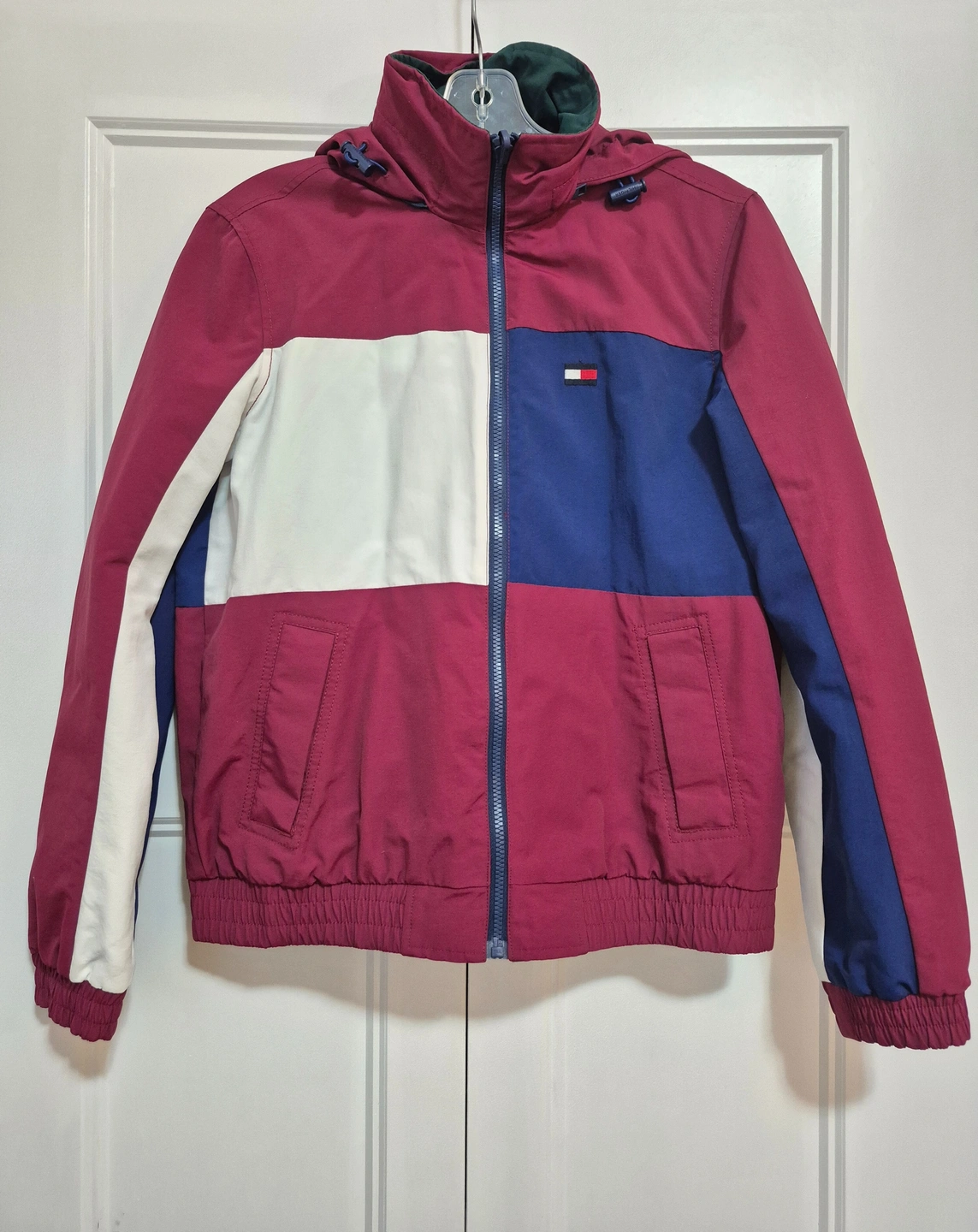 Tommy Hilfiger reversible jacket with a hood. One side is maroon, white, and blue, while the other side is green. It's in great condition!