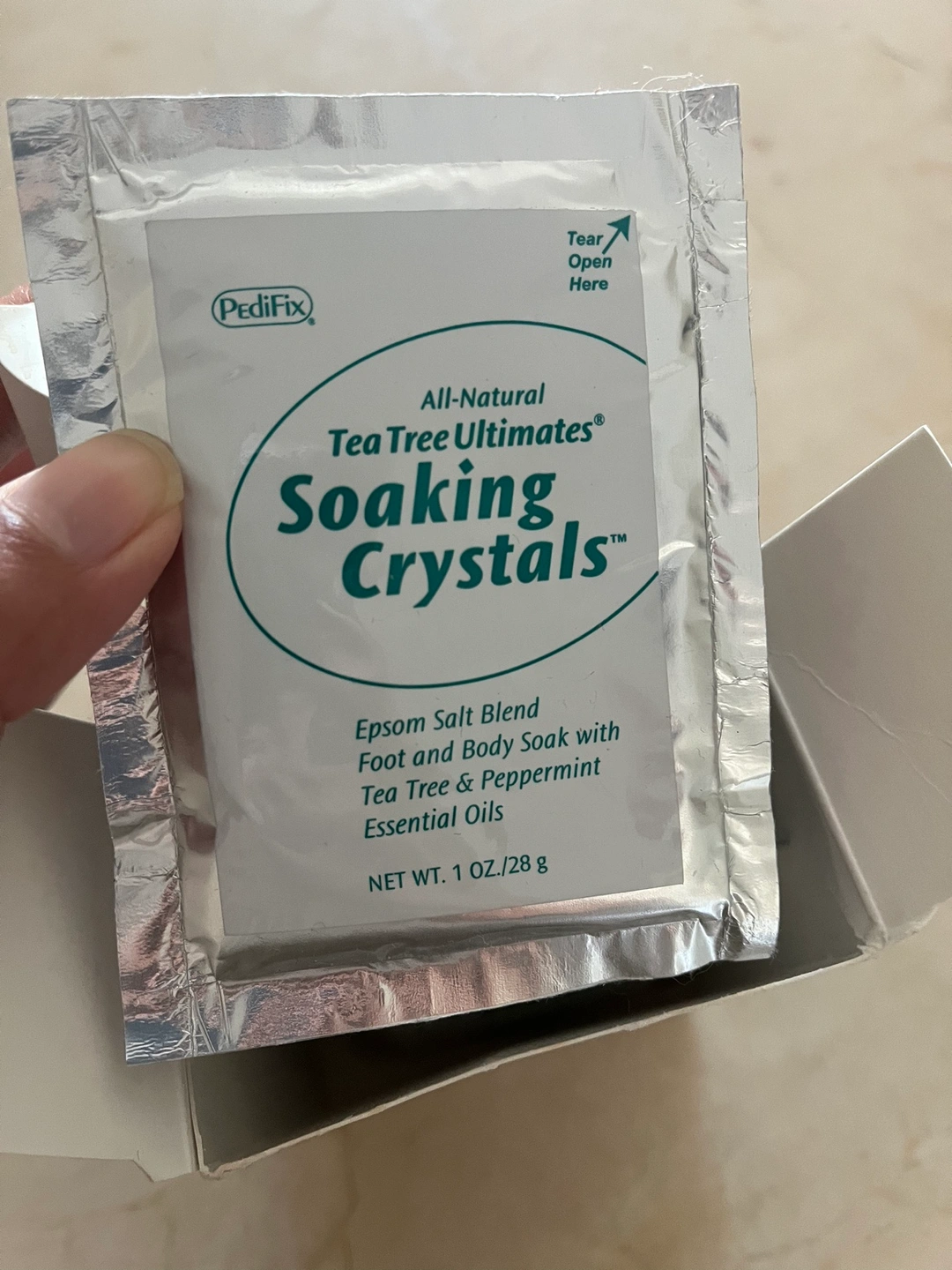 Single-use packet of foot soak crystals.