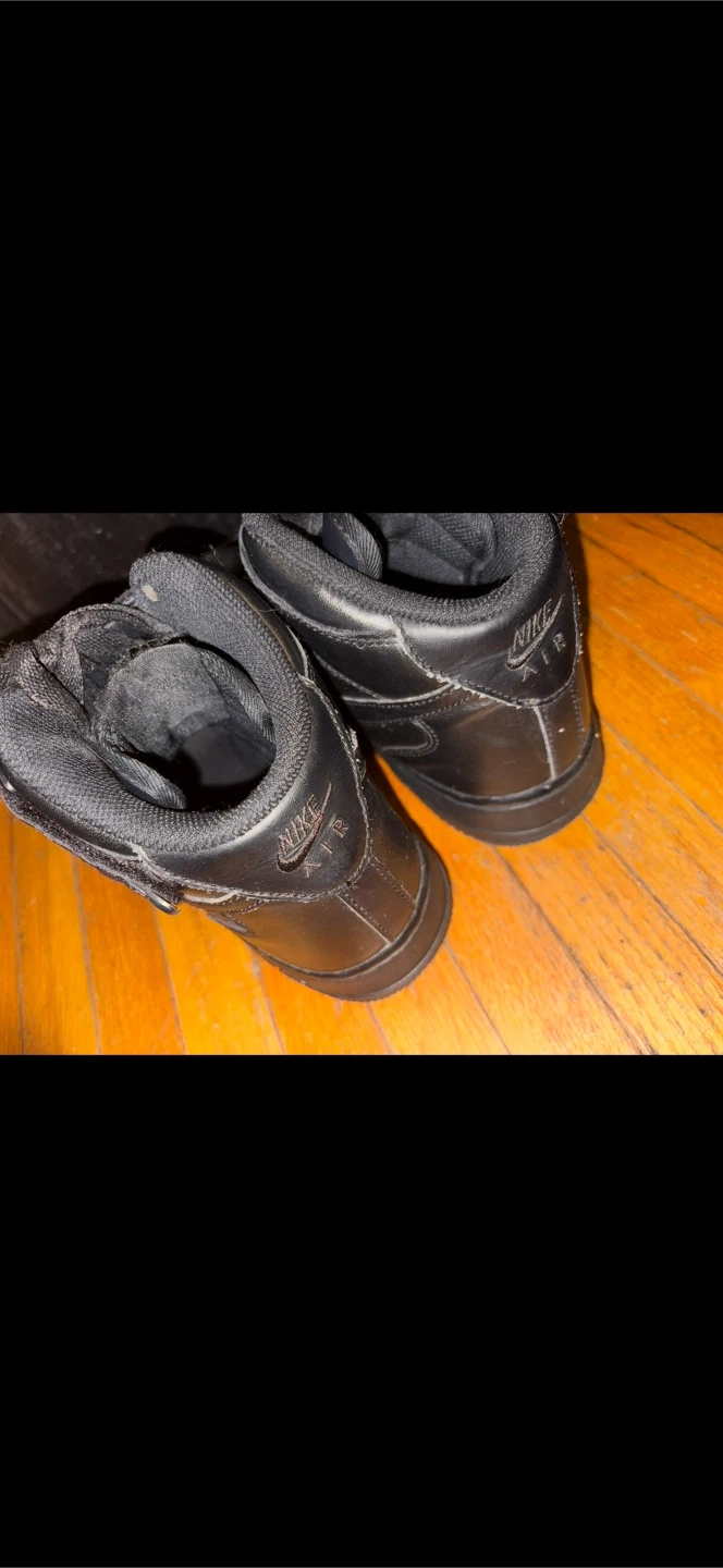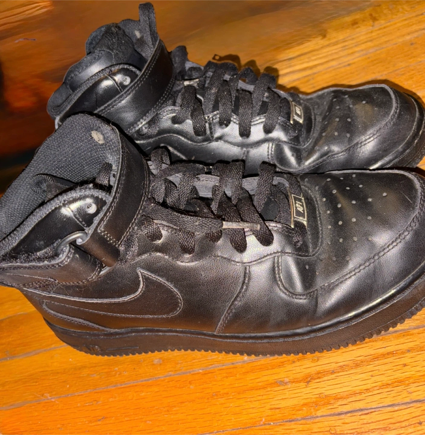 These are a pair of black Nike Air Force 1 high top sneakers. They're made of leather with a rubber sole. These sneakers are great for everyday wear. will be cleaned + new laces. Size 8 men