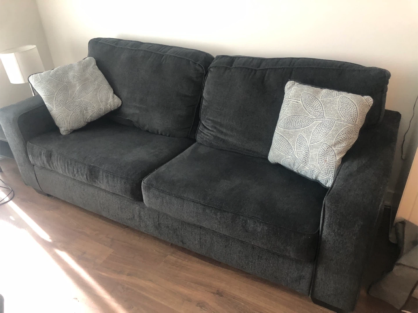 Comfortable dark grey sofa that easily converts into a bed. Includes two decorative pillows. Offers versatile seating and sleeping options for your home. Comes with comforter and two pillows.
