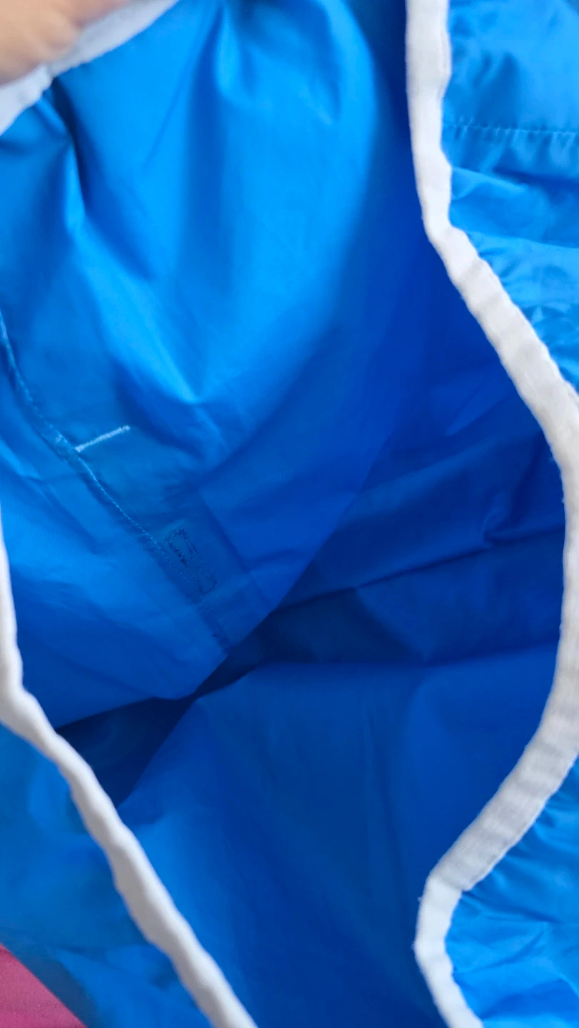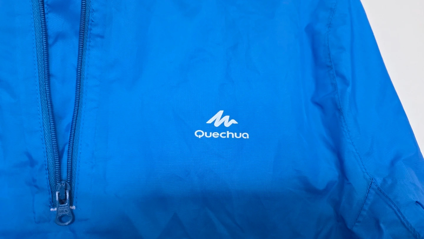 This Quechua raincoat iss blue and features a hood. It's lightweight and easy to pack away. Its zippered front and pockets offer convenient storage.