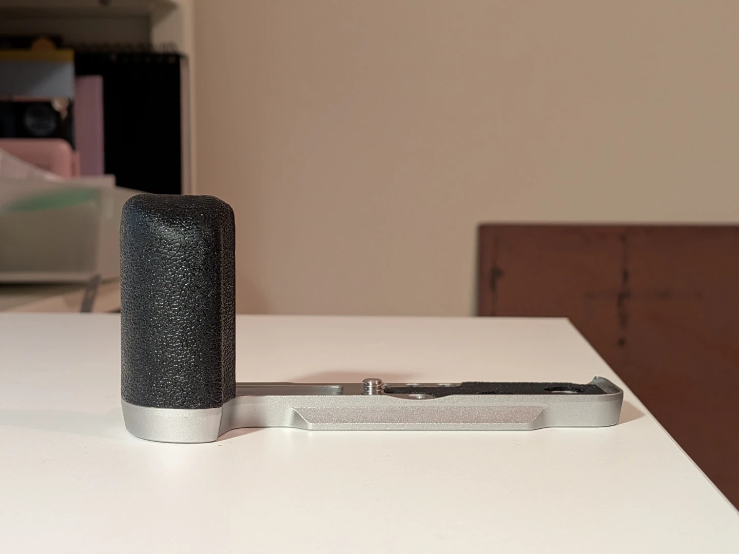 This is a SmallRig L-shape camera handle designed for Fujifilm X100VI and X100V cameras. It's made of aluminum and provides a better grip. The silver colour matches the camera body nicely.