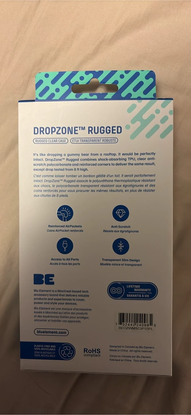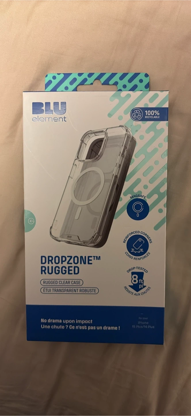 This is a Blu Element Dropzone Rugged clear case designed for the iPhone 15 Plus/14 Plus. It's made from a shock-absorbing TPU and polycarbonate material with reinforced corners for extra protection. The case is drop-tested to withstand up to 8 feet and offers anti-scratch and full port access. It's also MagSafe compatible!