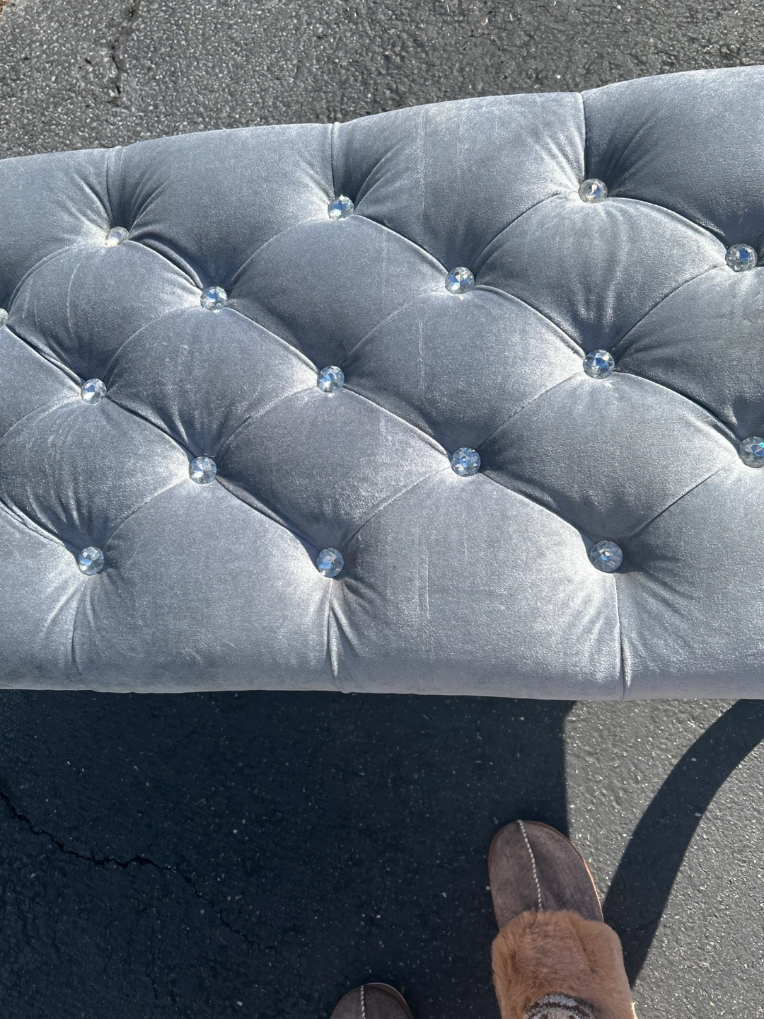 Here's a stylish tufted ottoman bench in a lovely gray color. It's perfect for adding a touch of elegance to any room. The bench features a comfortable tufted top with decorative buttons, and it's supported by sturdy legs. It's in great condition and ready to enhance your home decor!