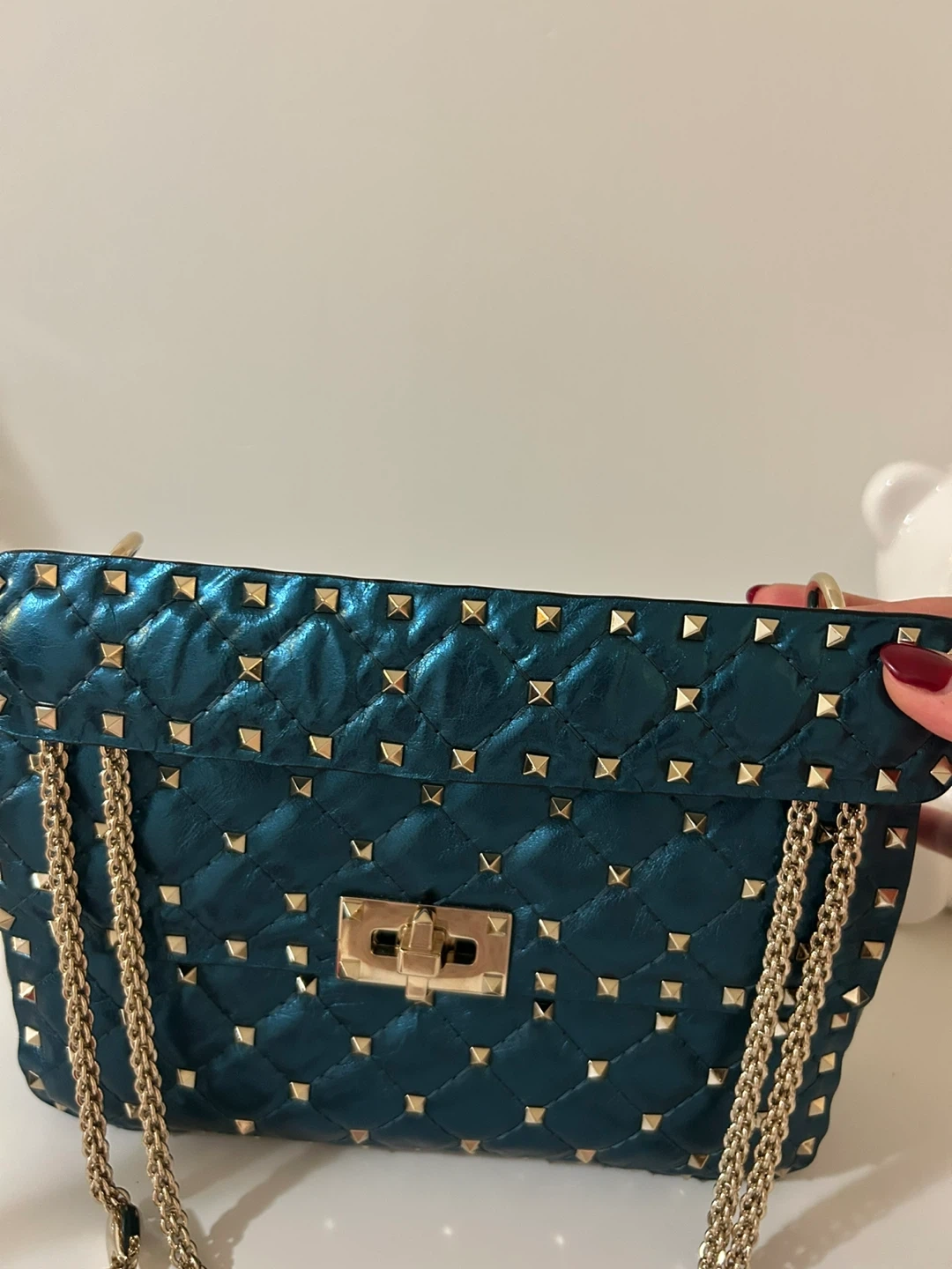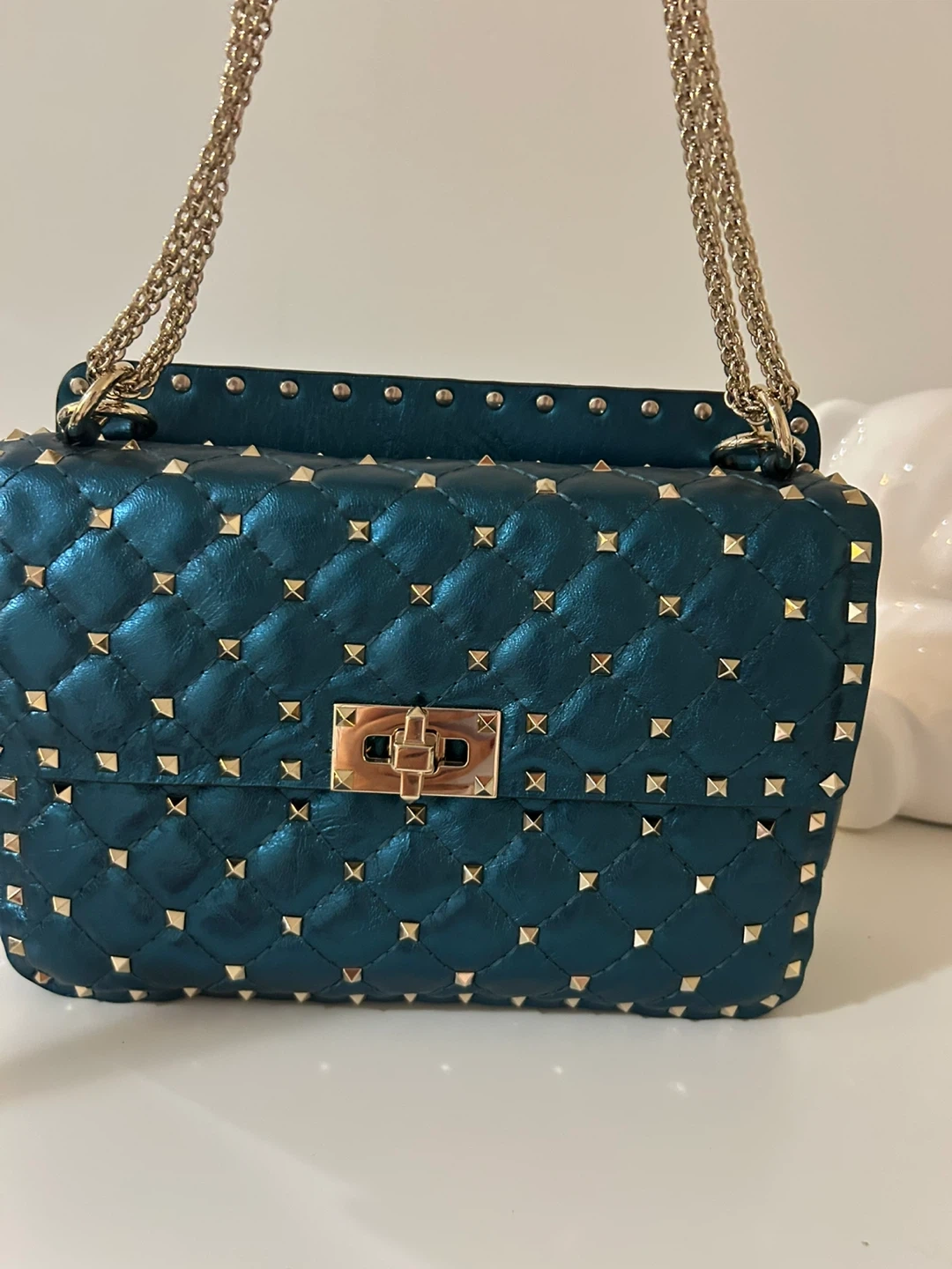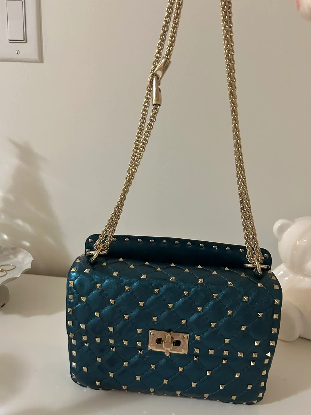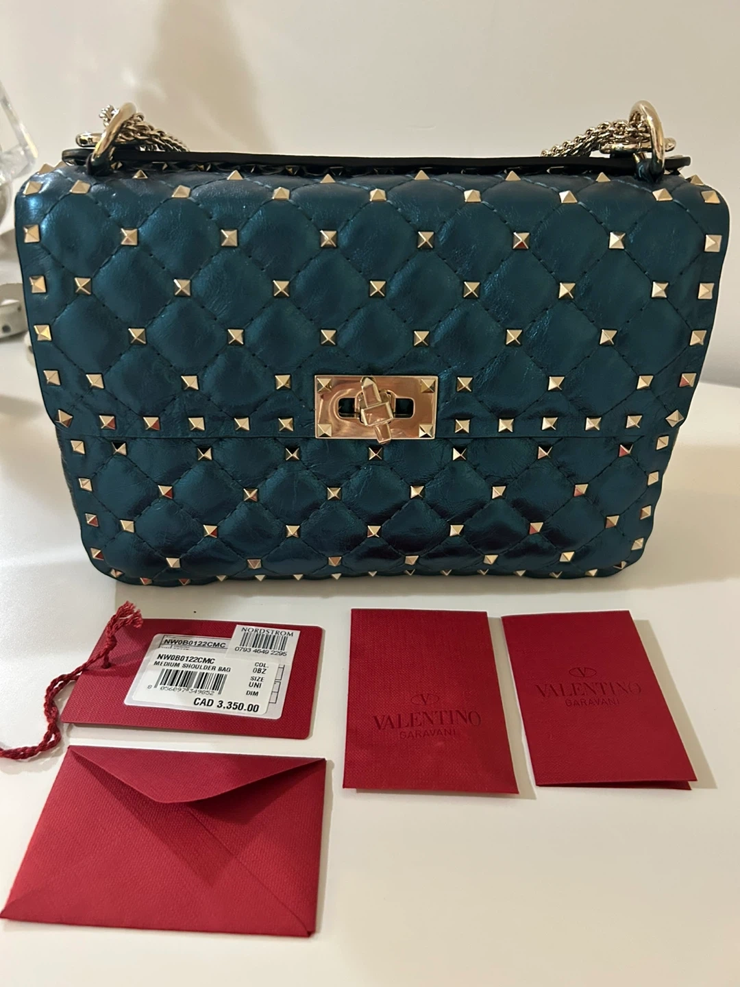 This is a Valentino Garavani medium shoulder bag in teal. It's made of quilted leather and features signature gold-tone Rockstud embellishments. The bag has a chain strap and a turn-lock closure. Includes original tags and dust bag. Never Used , there is a serial code inside just hard to take picture . Current price in store is 4400.00 plus tax.