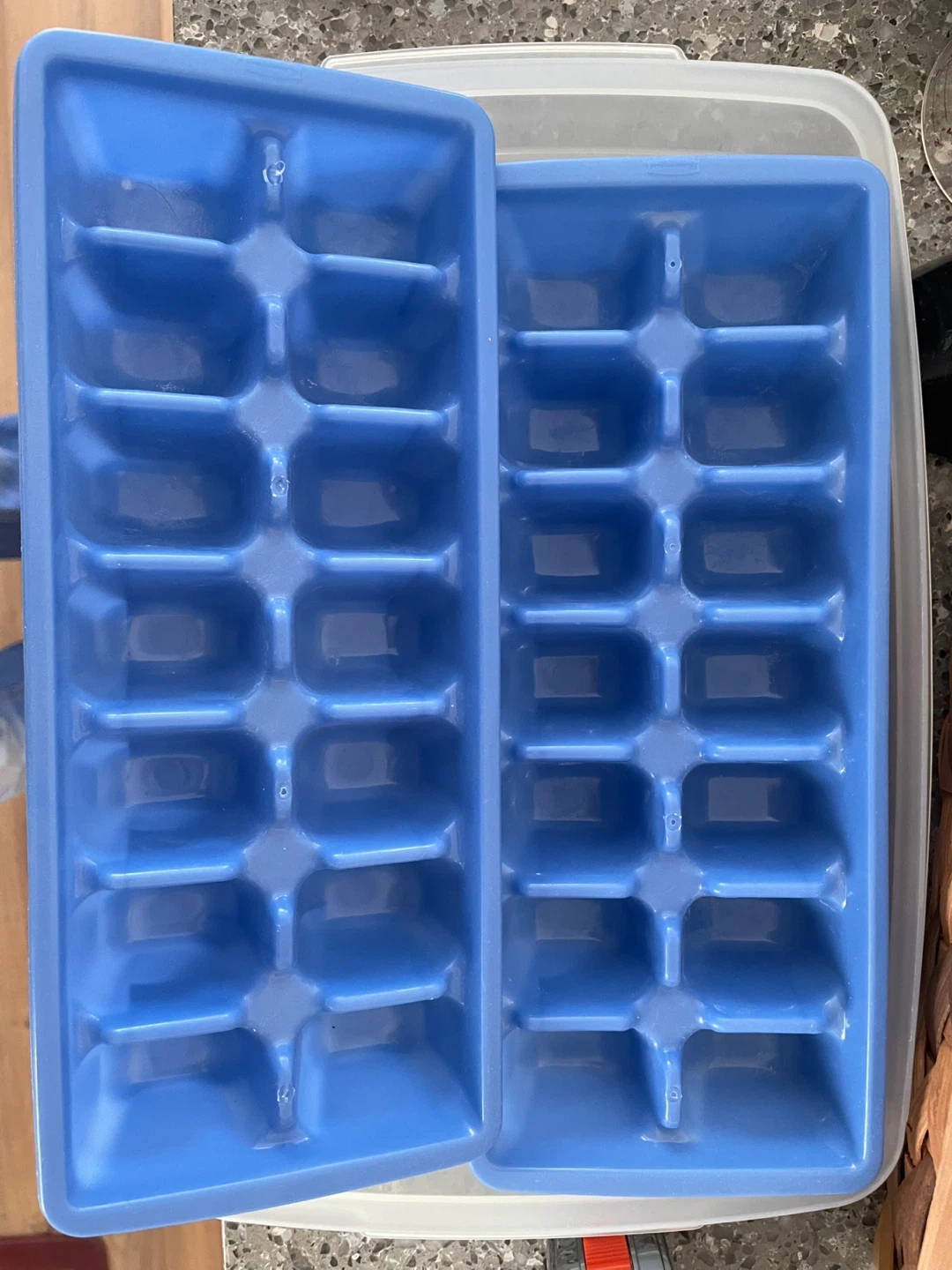 Two ice cube trays and an egg container. Includes one blue rectangular tray and one clear egg tray. Made by Rubbermaid.