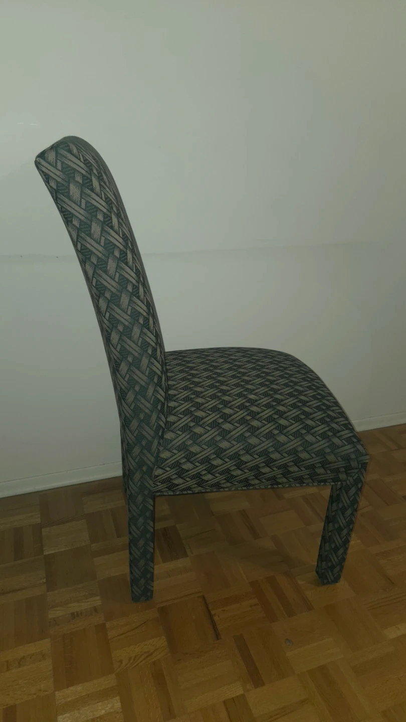 A set of 4 upholstered dining chair with a woven green and beige patterned fabric. The chair has a curved back and four sturdy legs.