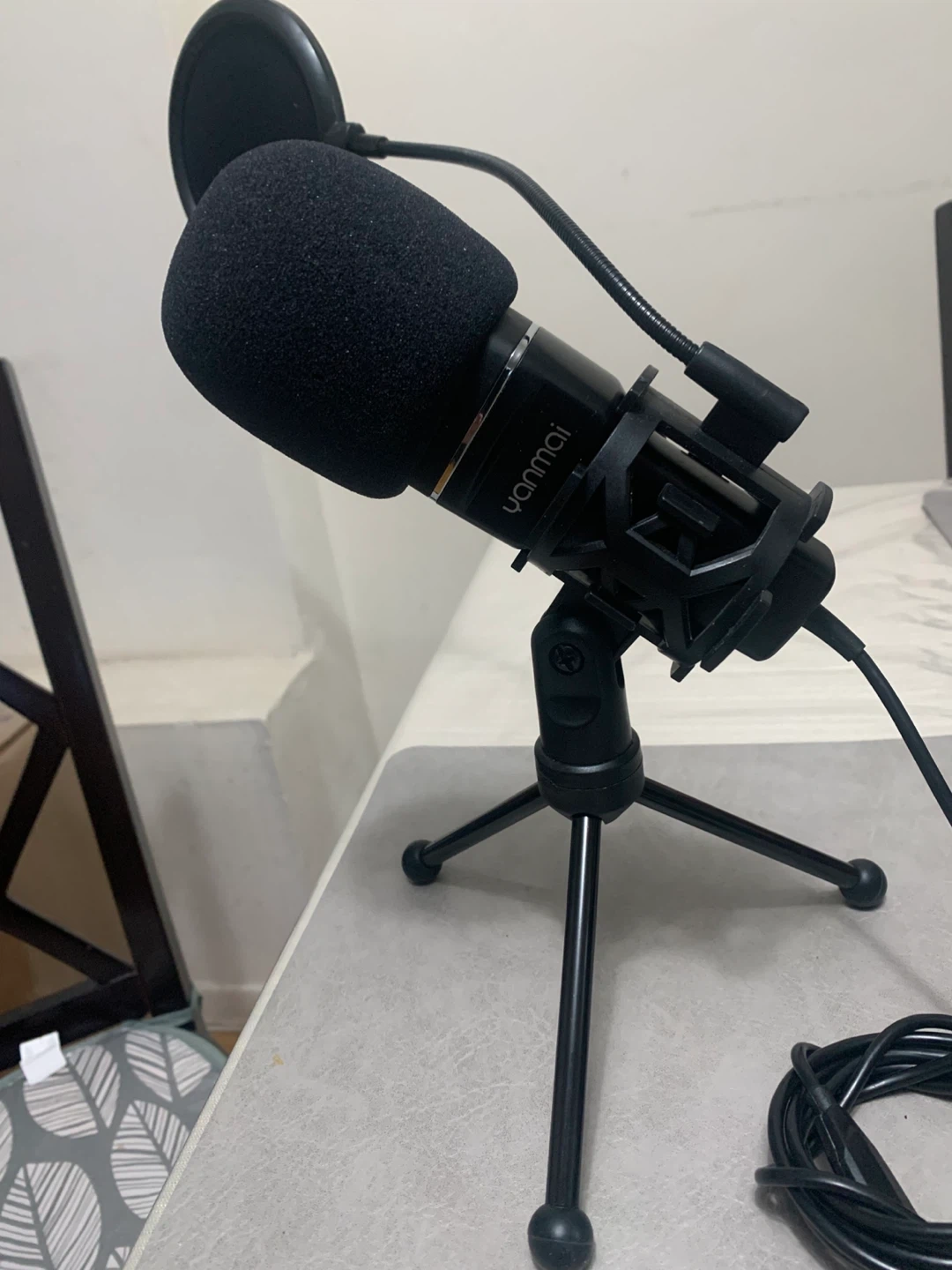 This Yenmai USB microphone kit is designed for clear audio recording. It comes with a shock mount and pop filter for better sound quality. The microphone includes a tripod stand for easy placement.