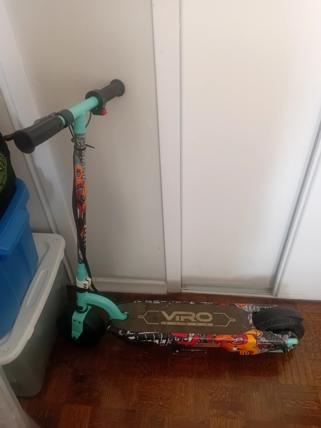 Viro Rides electric scooter with a cool graphic design. It's teal and black with vibrant decals. Great for kids to cruise around!