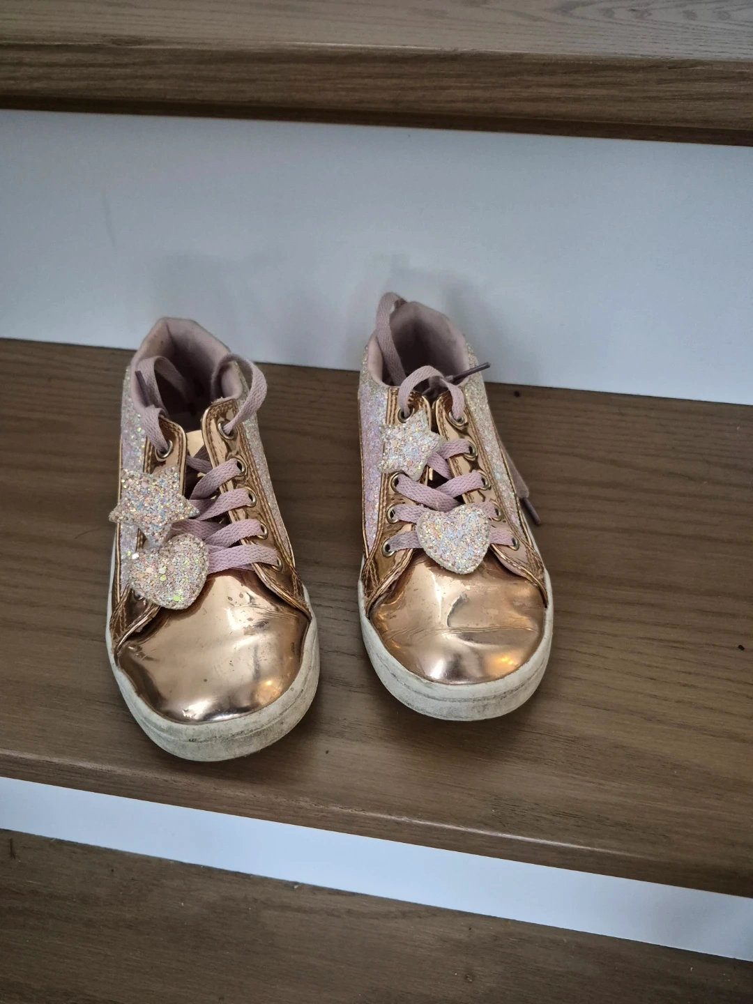 These cute girls' sneakers are size 1 and feature a sparkly rose gold colour. They have a star and heart design on the laces. They show some signs of wear, but still have lots of life left in them!