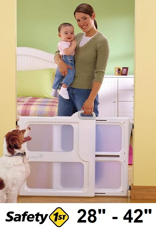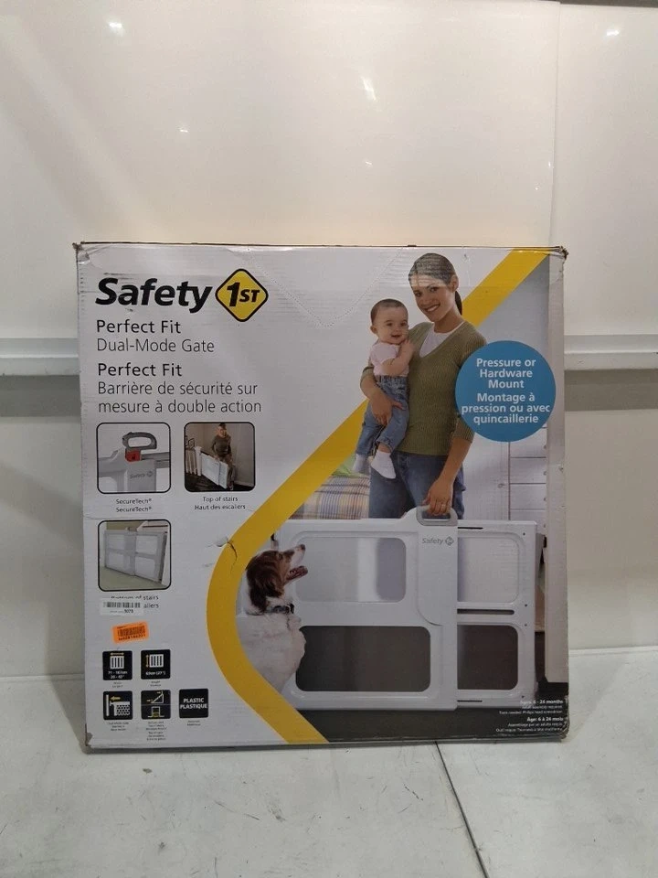 Keep your little ones safe with this Safety 1st Perfect Fit gate, designed to fit spaces between 28" and 42" wide and 27" high. This gate can be installed with either pressure or hardware, making it versatile for different openings. It features a SecureTech indicator to ensure it's securely locked and has a single-motion, top-release handle for easy operation.