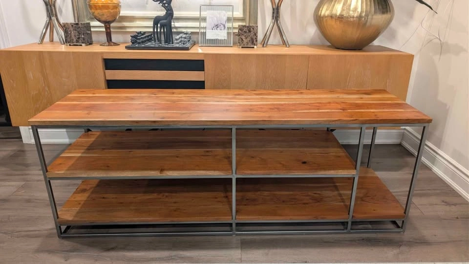 Wood characteristics: mineral deposits, grain, knots and seasonal splitting may occur with changes in humidity and are inherent in product Works as media console, coffee table, room divider or bookcase.