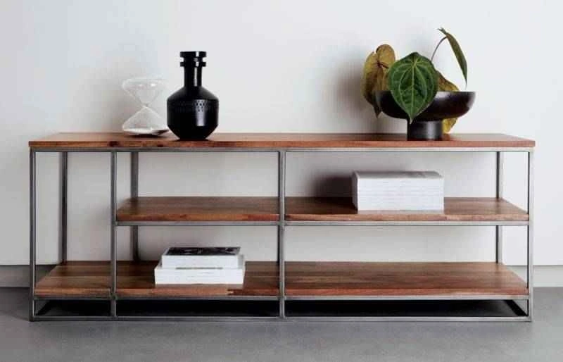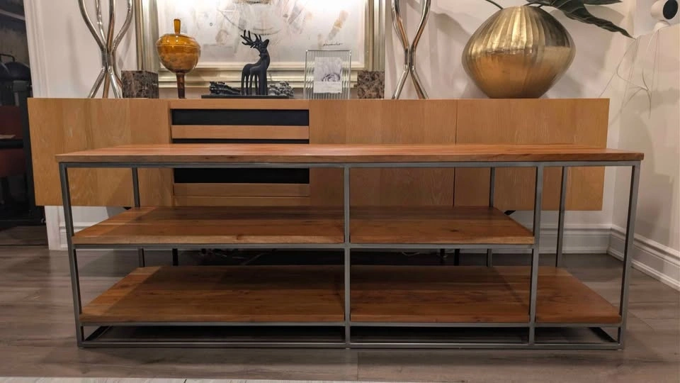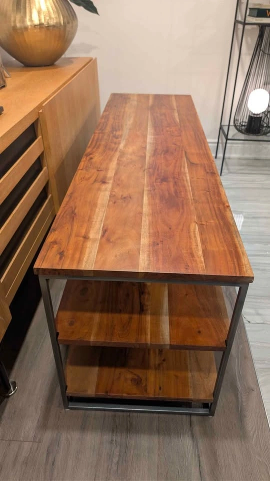 Nature channel. Architectural three-tier structure entertains in the raw. Braced by a sleek iron frame, wide planks of solid sustainable acacia wood show beautiful light-to-dark tones, active grain and naturally occurring knots.