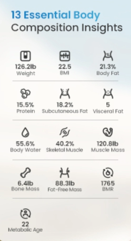 - Provides 13 essential body composition insights, including weight, BMI, body fat, protein, and more