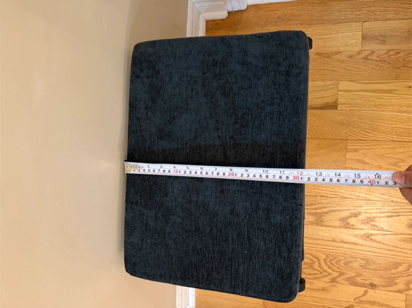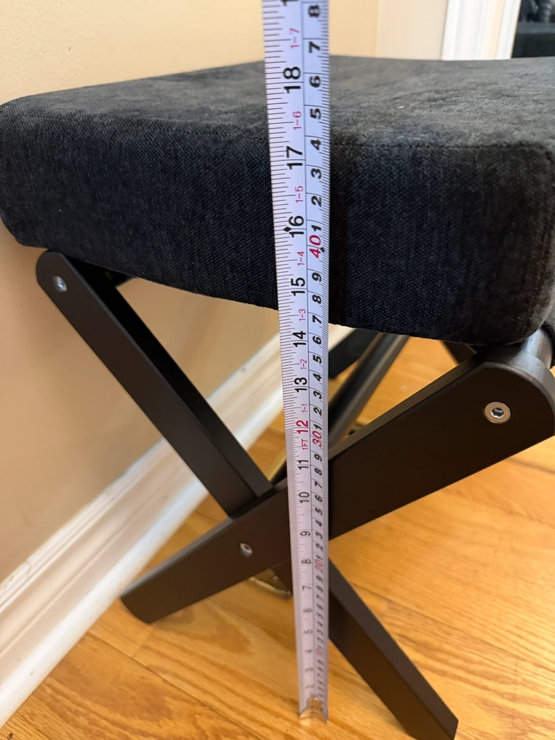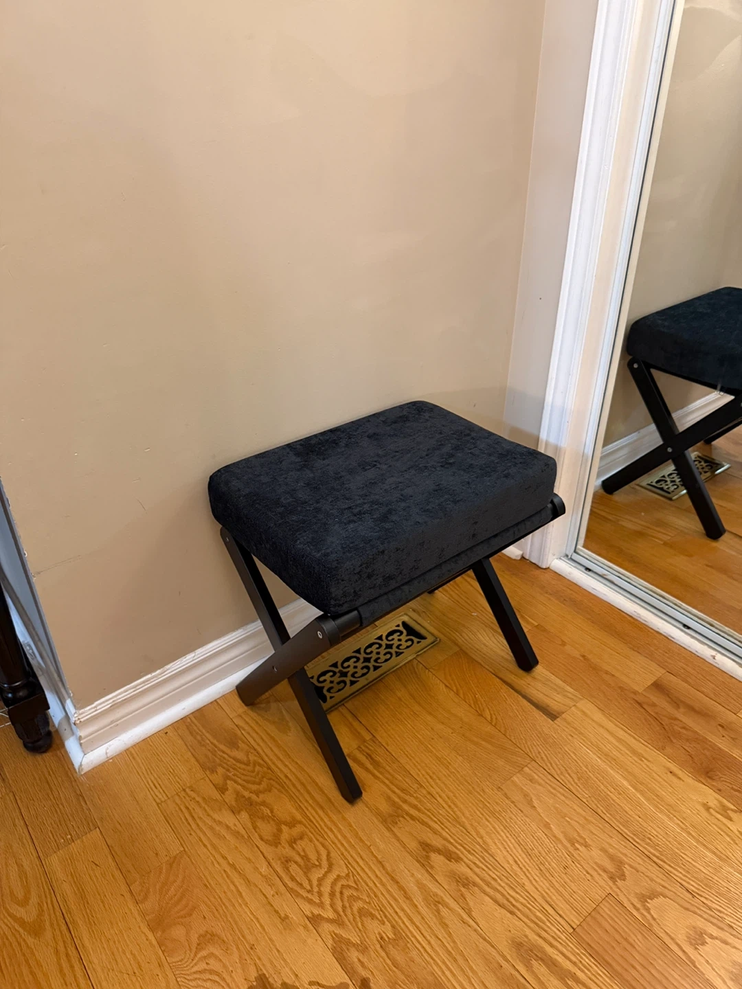 This is a black upholstered folding stool. It's a compact size, perfect for a vanity or extra seating. The frame is black wood and the upholstery is fabric.