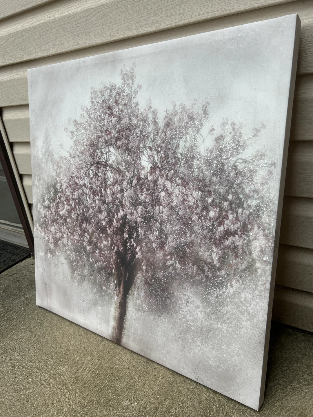 This is a canvas print featuring a blooming tree in soft, misty tones with sparkles. It's a landscape piece suitable for home decor. The print is stretched on a canvas frame.