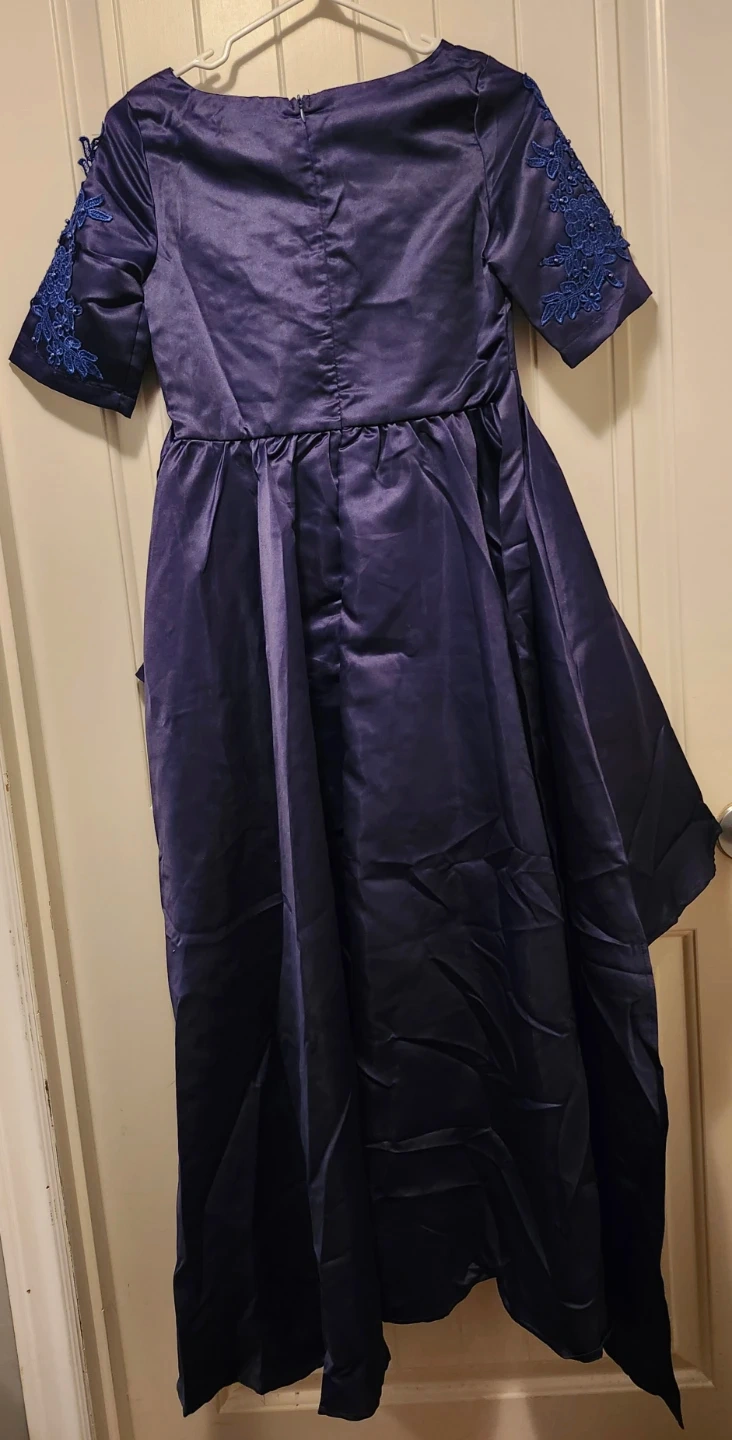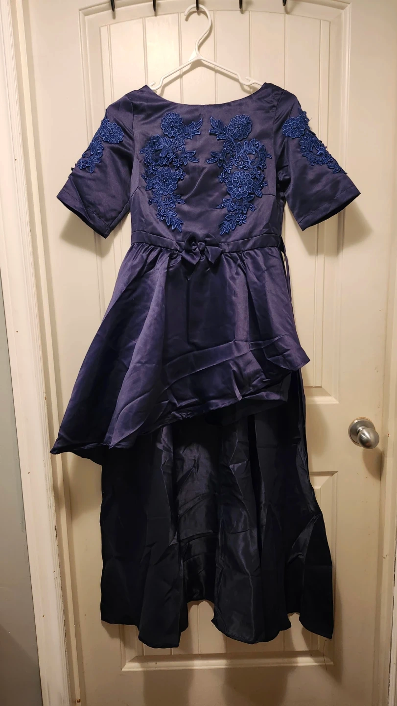 Beautiful navy blue dress from Ibtom Castle. It features intricate blue lace detailing on the bodice and sleeves. Perfect for a special occasion!