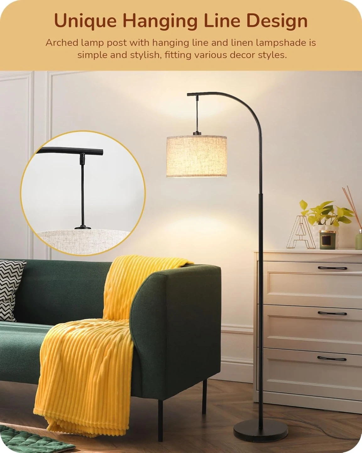 [Unique Hanging Line Design] Matte paint surface and curved lamp post paired with hanging line design and linen lampshade are simple and stylish, this arched floor lamp is suitable for various scenes, such as living room, reading room, office