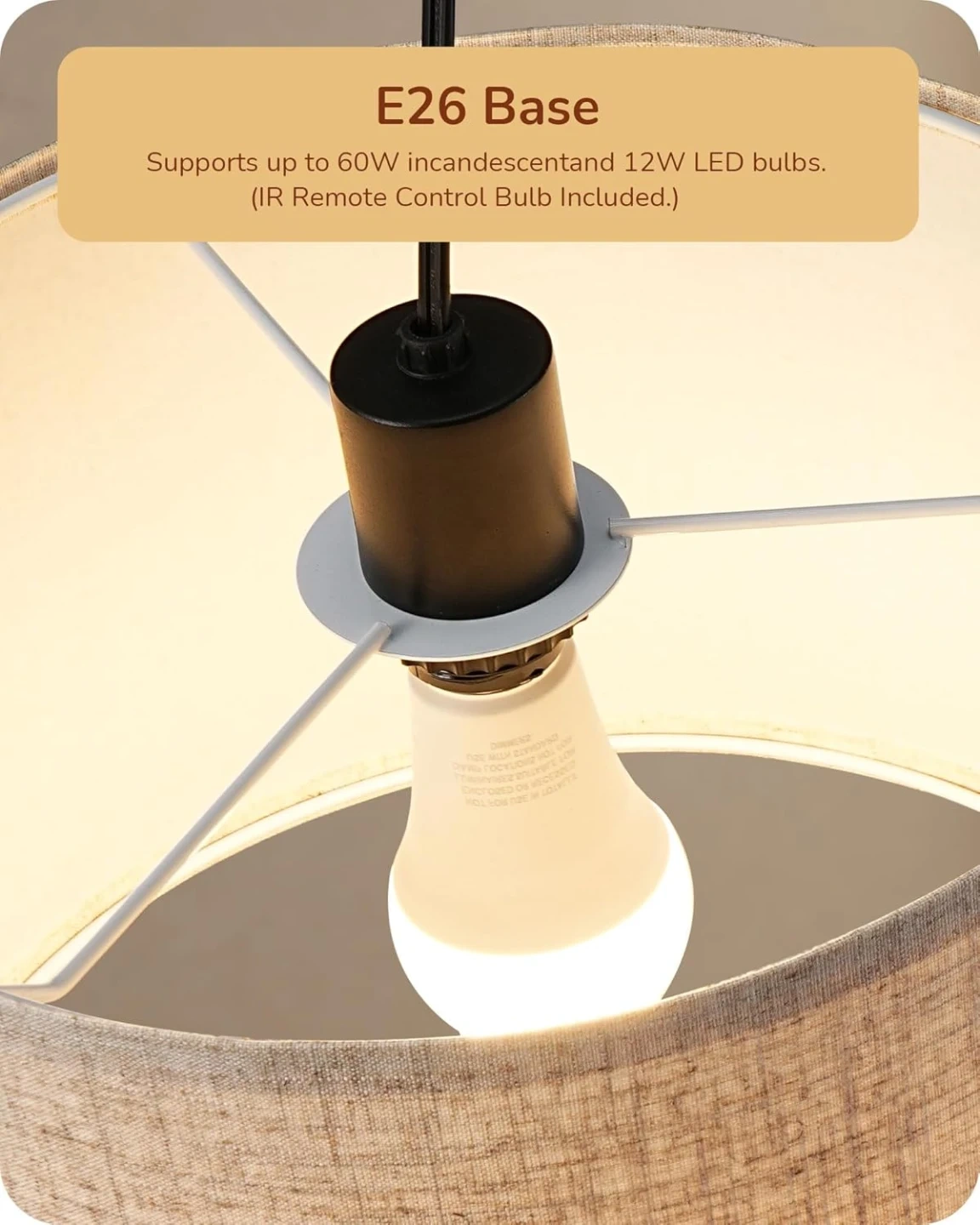 [Easy Installation & Bulb Included] Just need to tighten the pole and screws, then attach the lampshade and bulb (IR remote control bulb included); E26 base, supporting a maximum power of 60W Incandescent bulb or 12W LED bulb