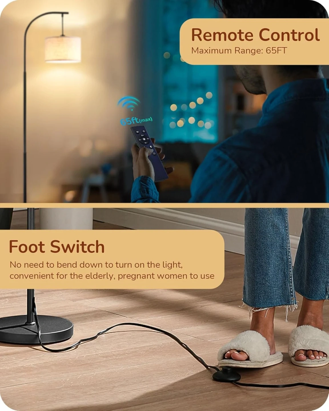 [Remote & Foot Switch] Comes with both remote control and foot switch, eliminating the need to bend over or search in the dark to operate the standing floor lamp, this convenience is particularly beneficial for elderly individuals and pregnant women