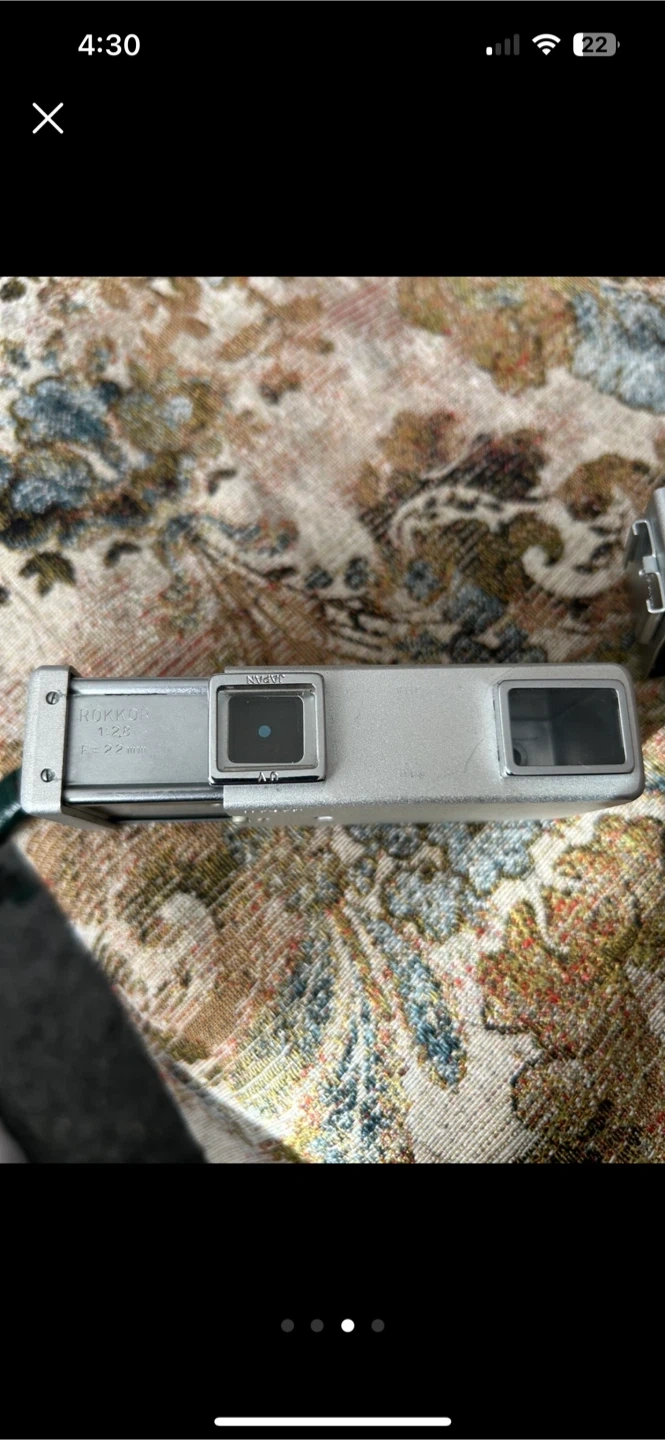 This is a Minolta-16 subminiature camera. It's made of metal and comes with a strap and a combination lock attached. It's a compact camera that uses 16mm film.