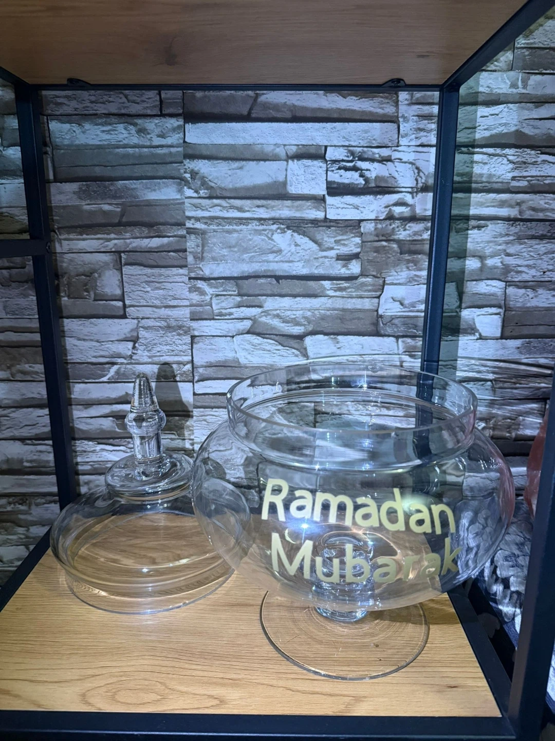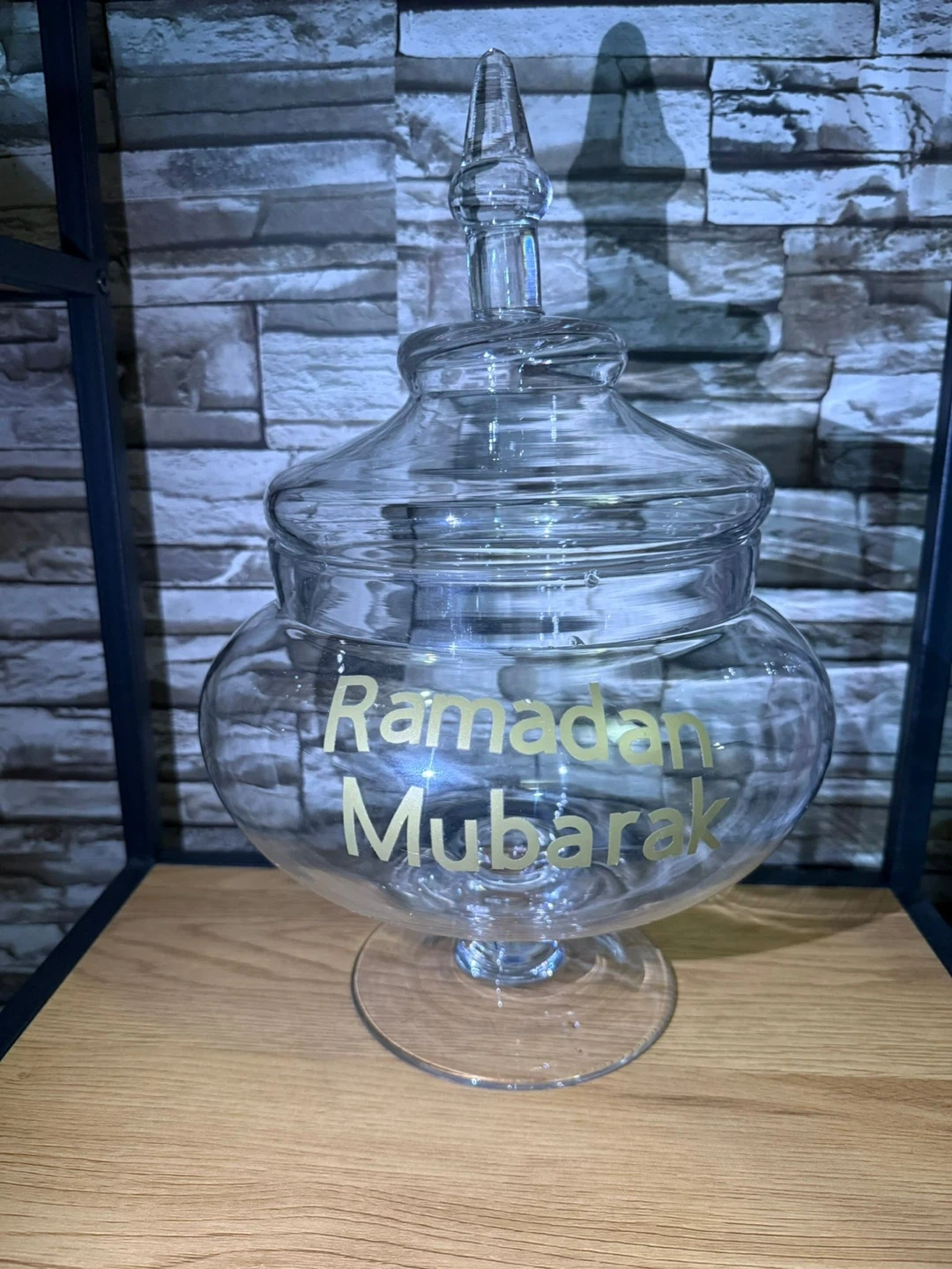 This is a decorative glass jar with "Ramadan Mubarak" printed on it. It includes a matching glass lid. Perfect for holding treats or as a table centrepiece during Ramadan celebrations!