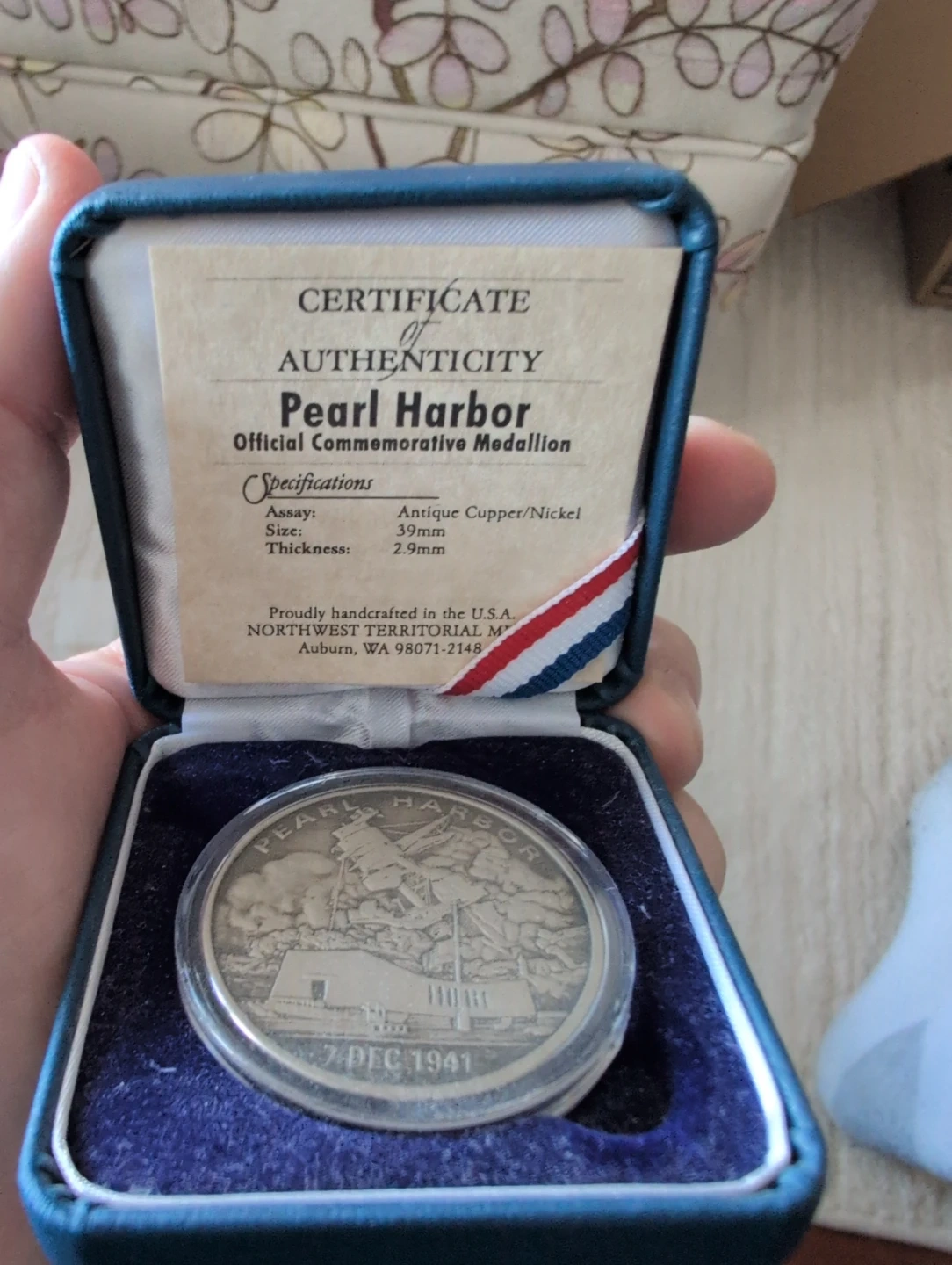 This is the Official Pearl Harbor Commemorative Medallion. It's made of antique copper/nickel with a size of 39mm and a thickness of 2.9mm. This medallion comes in its original presentation box with a certificate of authenticity.