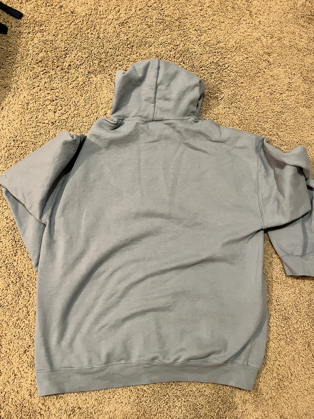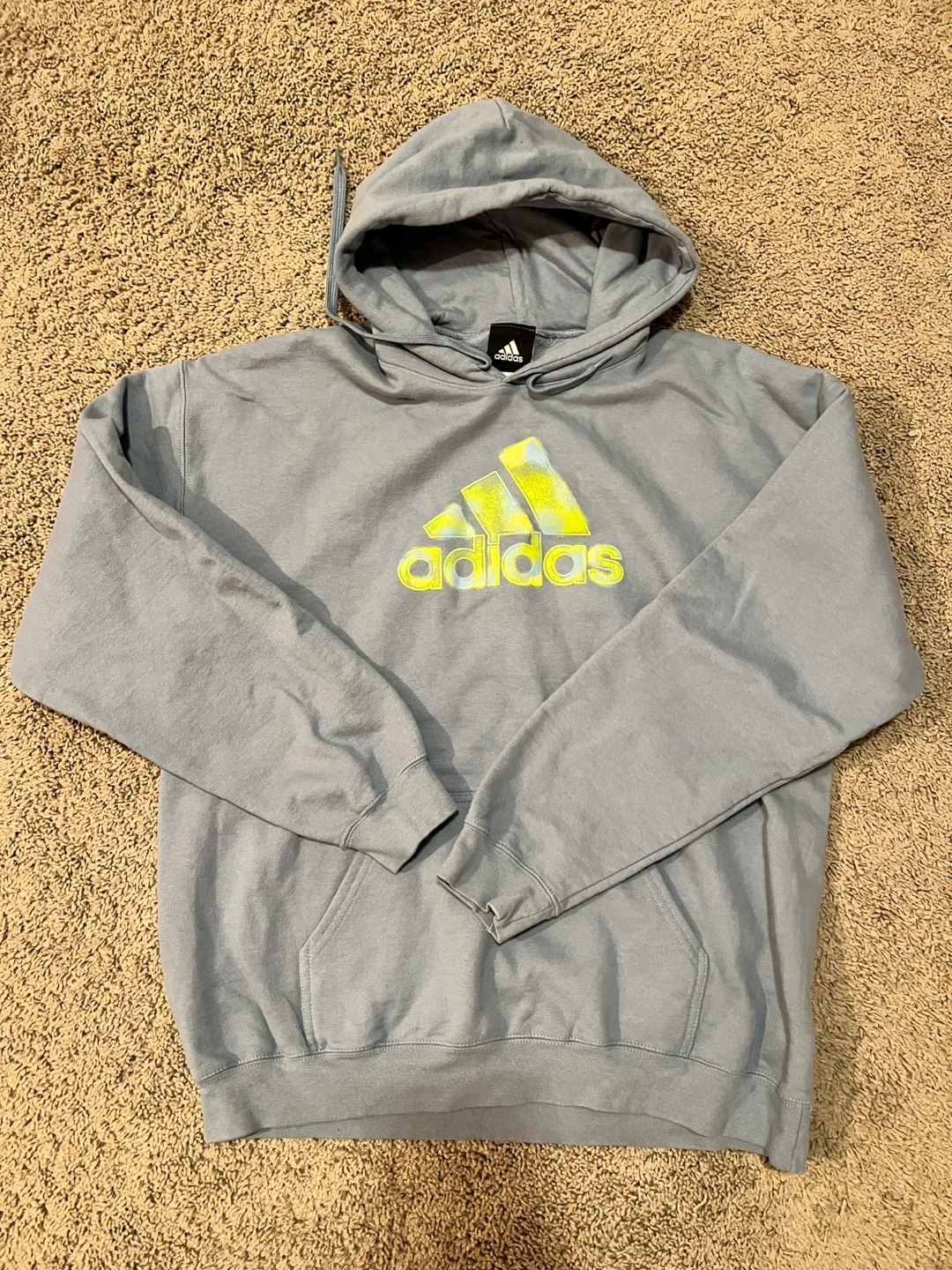 This is an Adidas pullover hoodie in a size large. It's made from 80% cotton and 20% polyester. This hoodie features a kangaroo pocket and an adjustable drawstring hood.