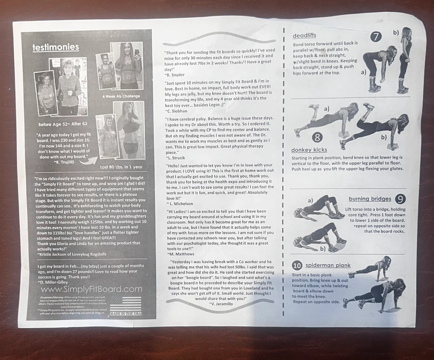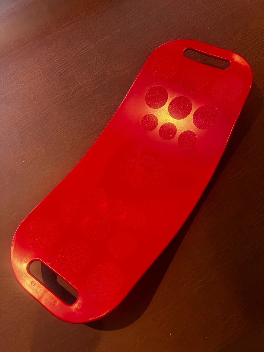 This is a red Simply Fit Board balance board. It's designed for balance and core workouts. It's great for targeting muffin tops and strengthening your core! Comes with instructions.