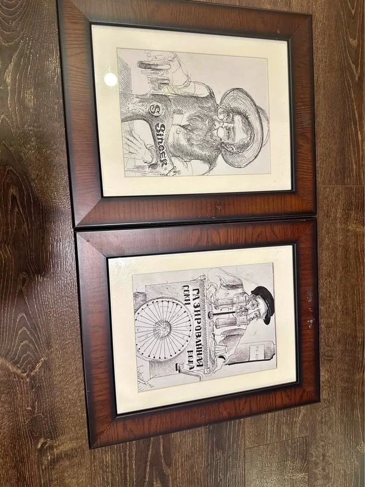 Beautiful pair of vintage pen-and-ink prints featuring classic Eastern-European Jewish tradesmen: a tailor with a Singer sewing machine and a seltzer man with Russian lettering. Both pieces are framed identically in matching wood frames and look great displayed as a set. Very nostalgic, charming artwork — perfect for a hallway, office, kitchen, or vintage-inspired décor. Frame Size: 14.5” × 17.5” each. Style: Shtetl / Jewish folk-art illustration. Condition: Great vintage condition; clean and ready to hang. Sold as a pair. Hard-to-find matching pair. Pickup available.
