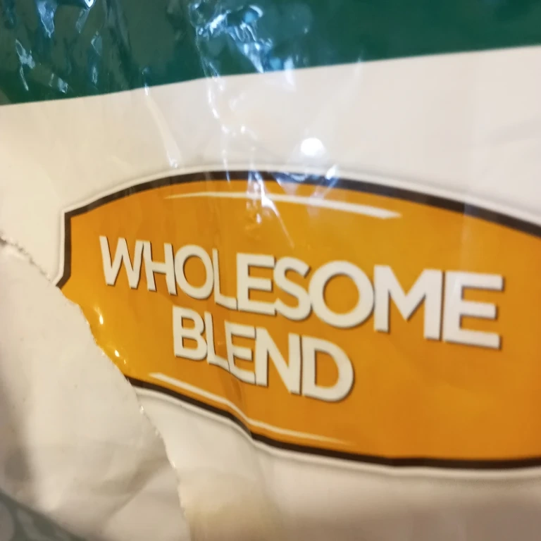 This is an open half bag of Wholesome Blend large breed dog food.
