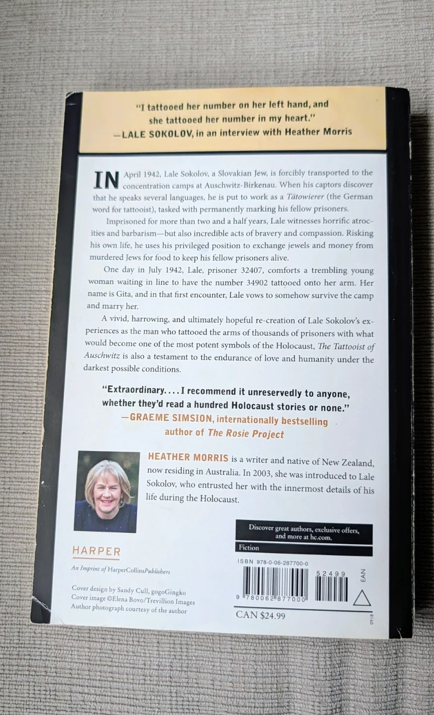 This novel tells the incredible true story of Lale Sokolov, a Jewish prisoner at Auschwitz who was forced to tattoo identification numbers onto fellow prisoners. It's a powerful account of survival and humanity amidst unimaginable horror. The book is written by Heather Morris.