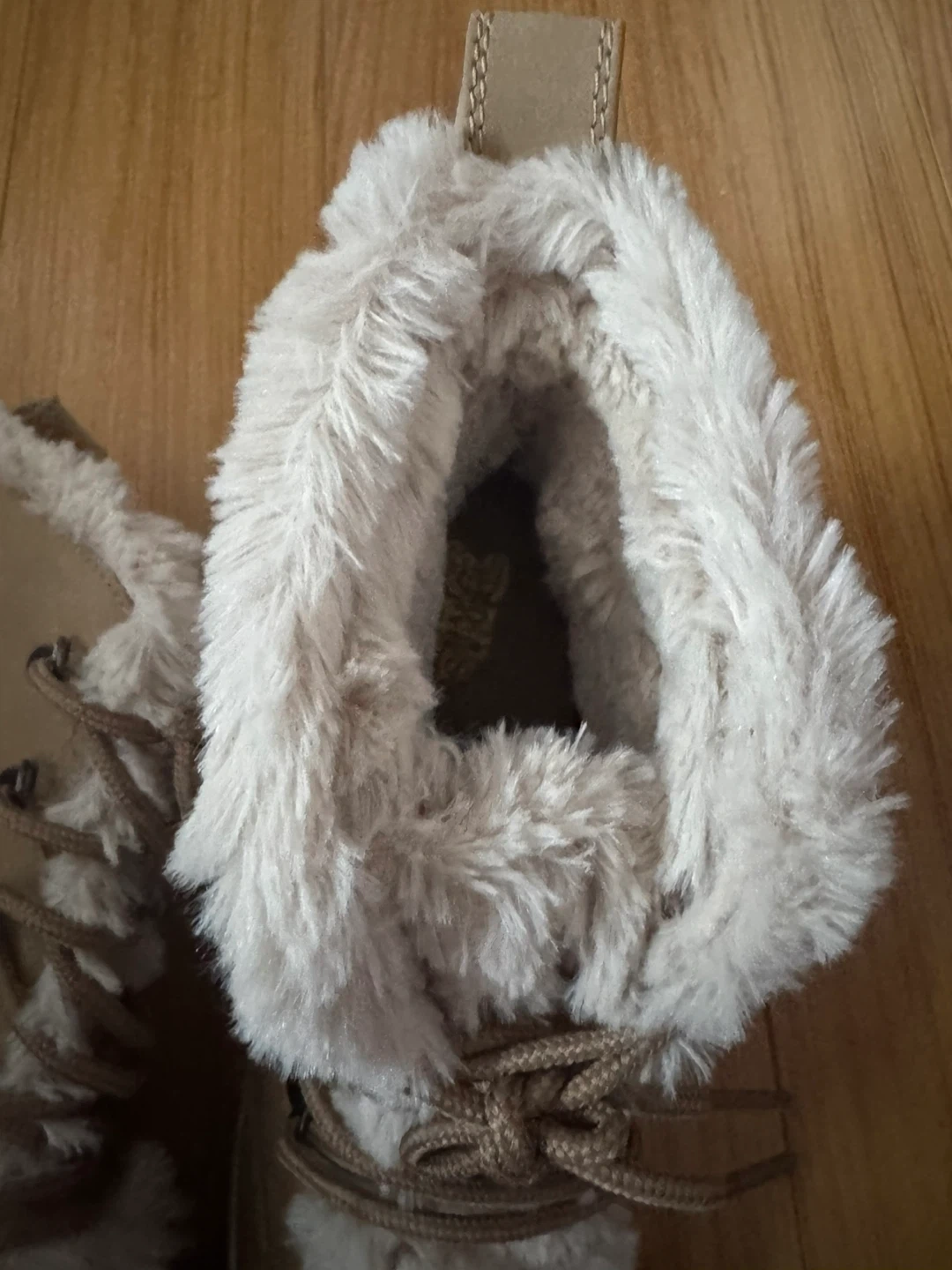 Warm tan wedge boots with faux fur lining for added comfort and style. They feature a lace-up front for a secure fit. These boots are designed for a cozy feel.