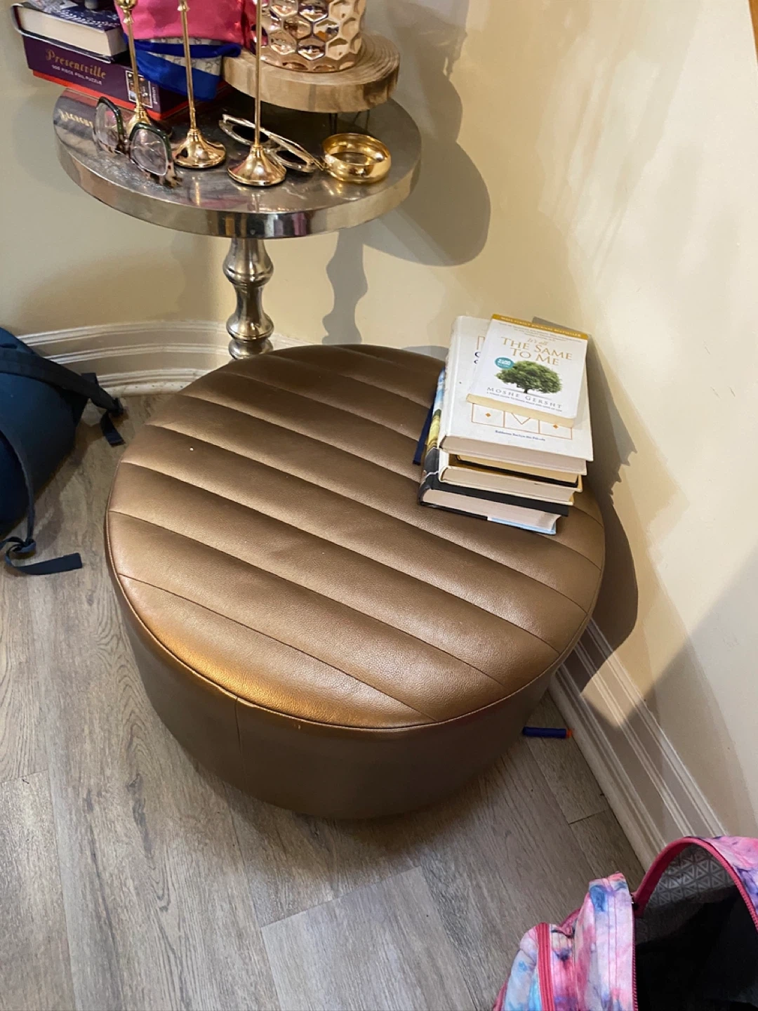 A stylish round ottoman with a bronze, tufted upholstered top. It's perfect for adding extra seating or as a footrest. Its compact size makes it versatile for various rooms.