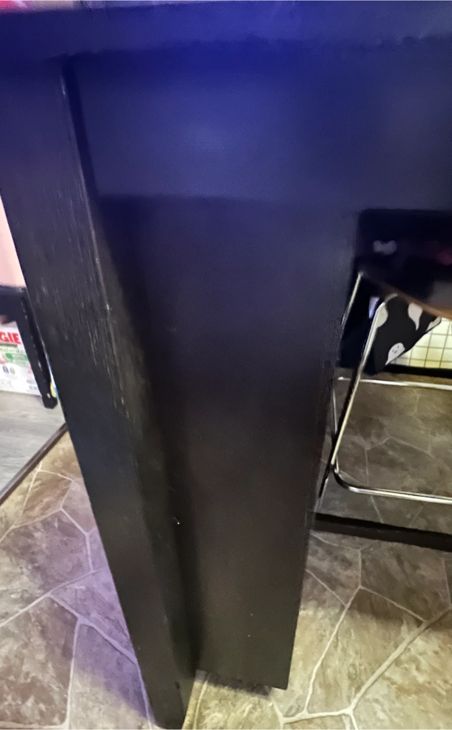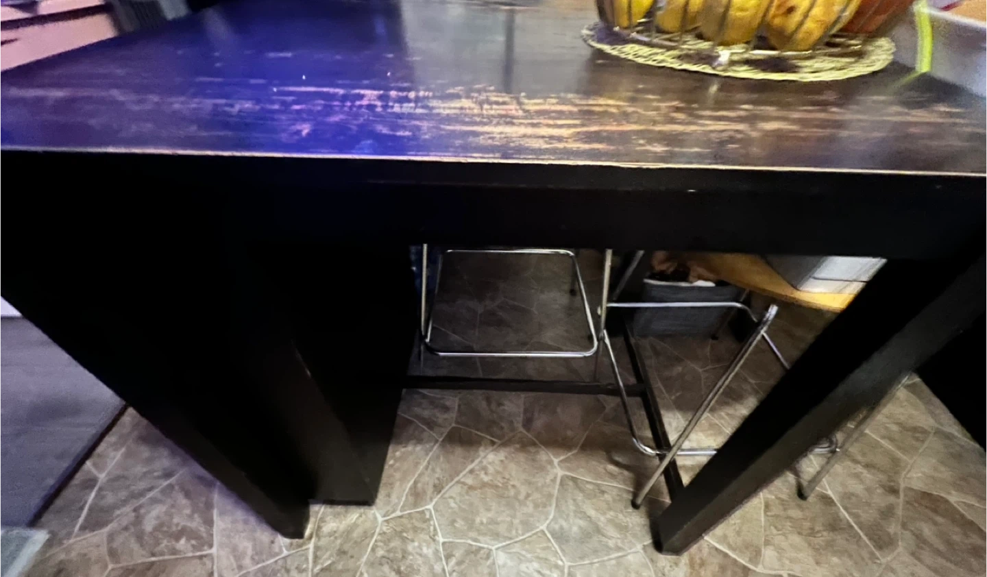 Selling a dark brown bar table! It features convenient shelving for storage. The table shows some signs of use on the top surface. Top surface can be fixed by using Fast Dry Woodstain to refinish it. Great for adding a stylish touch to your kitchen or dining area.