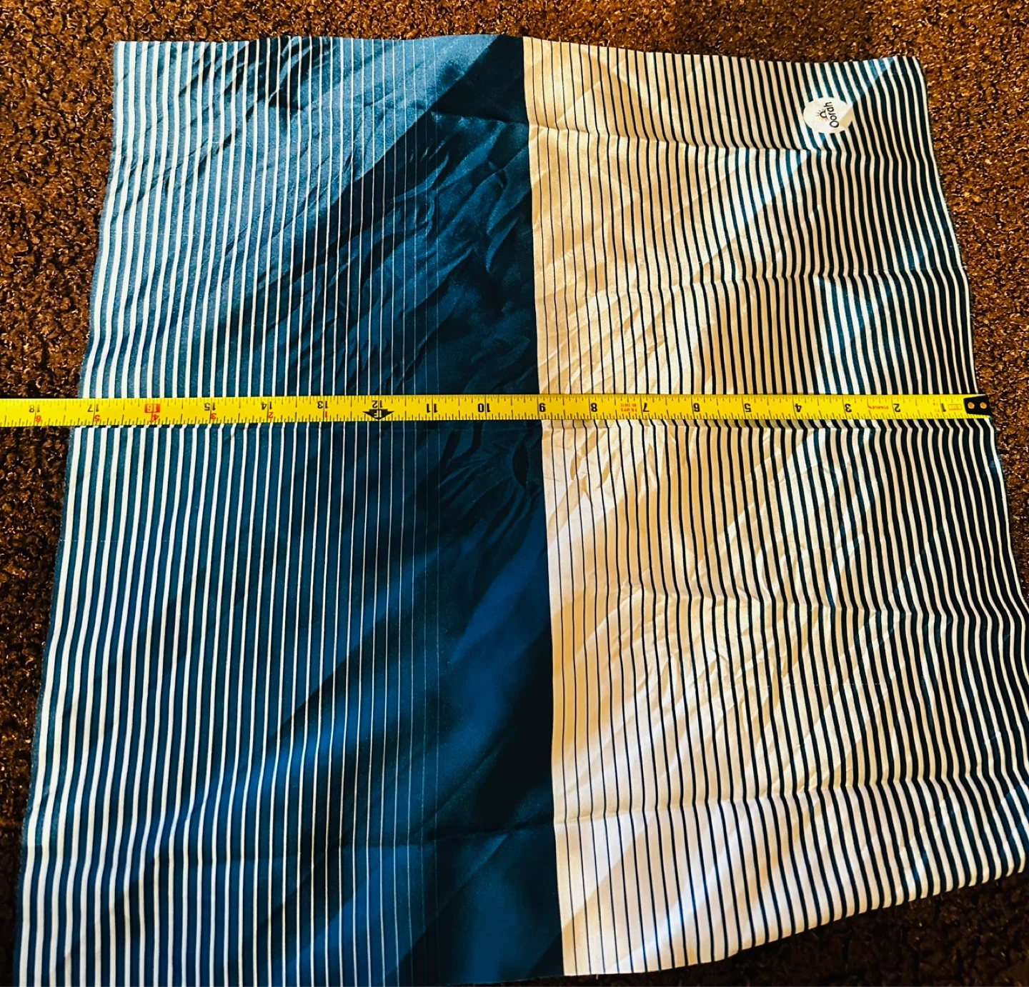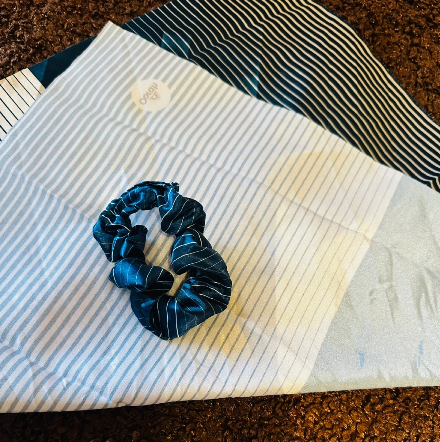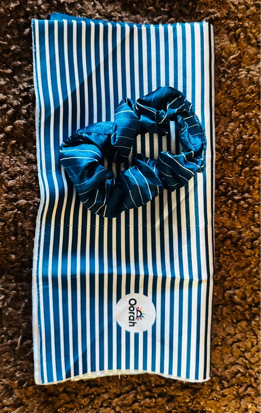 Set includes a satin scrunchie and a matching bandana. Both items feature a blue and white stripe pattern.