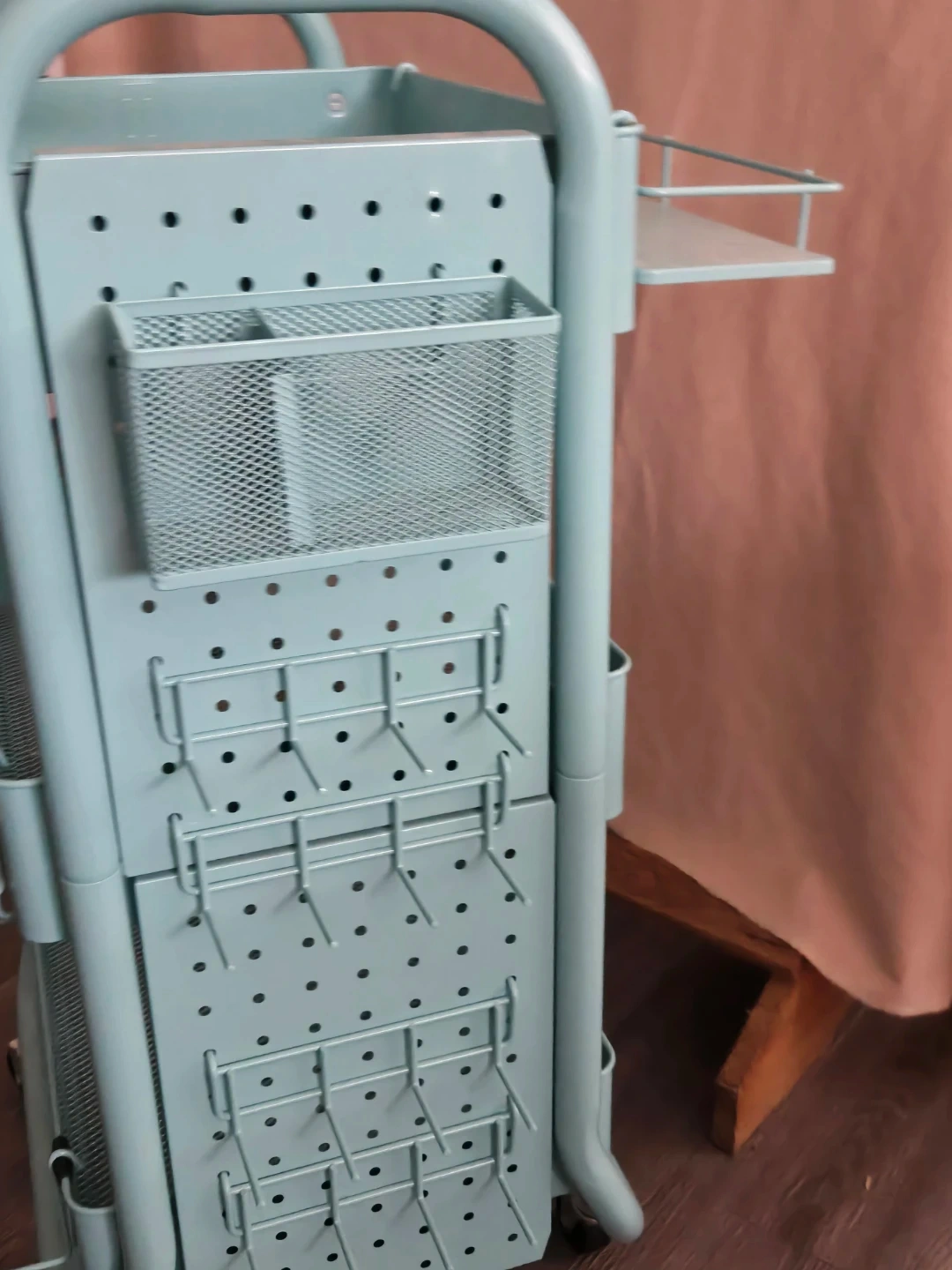 Selling my metal utility rolling cart, very sturdy & versatile, in great condition. Has 3 mesh shelves, pegboard side with 16 hooks, a side basket for pencils etc , 4 large side attachments and rolling casters that can lock in place.