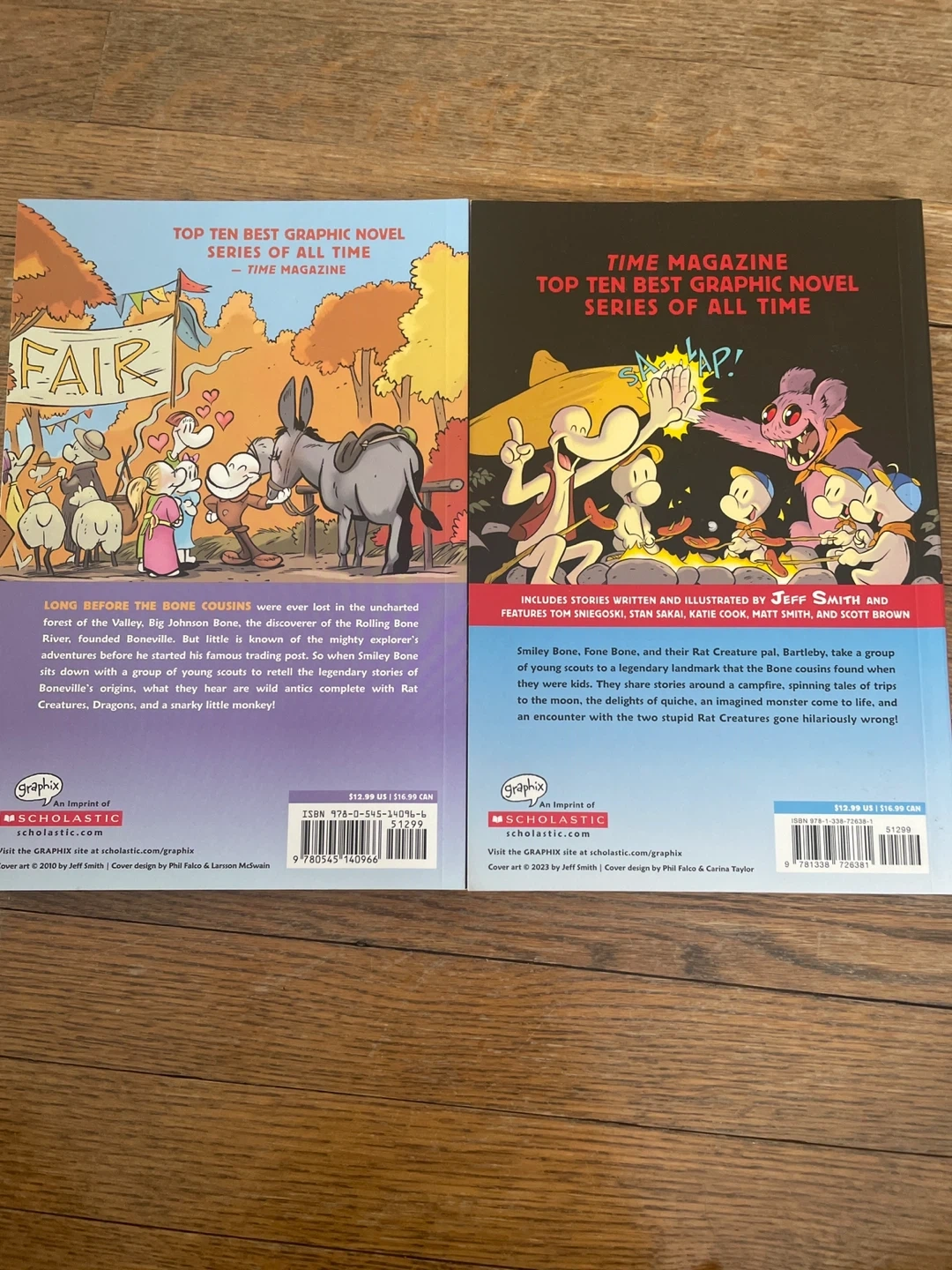 Two Jeff Smith Bone graphic novels: Tall Tales and More Tall Tales. Both books are from Scholastic. And are the extra stories for the book series Bone.