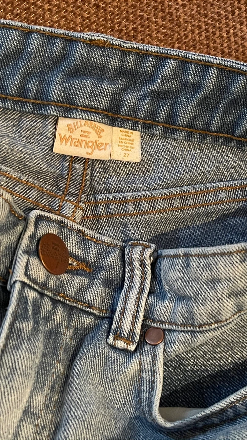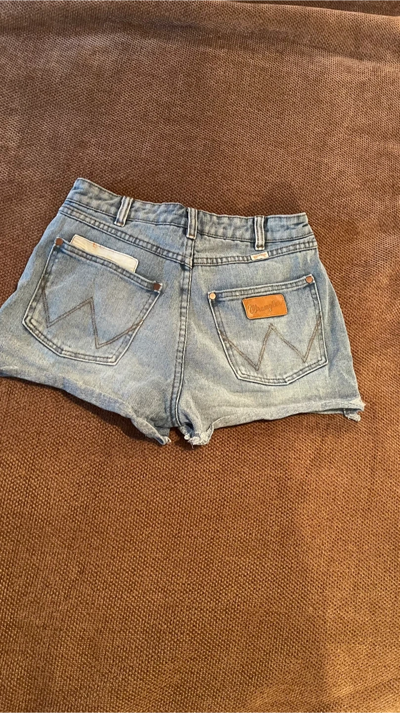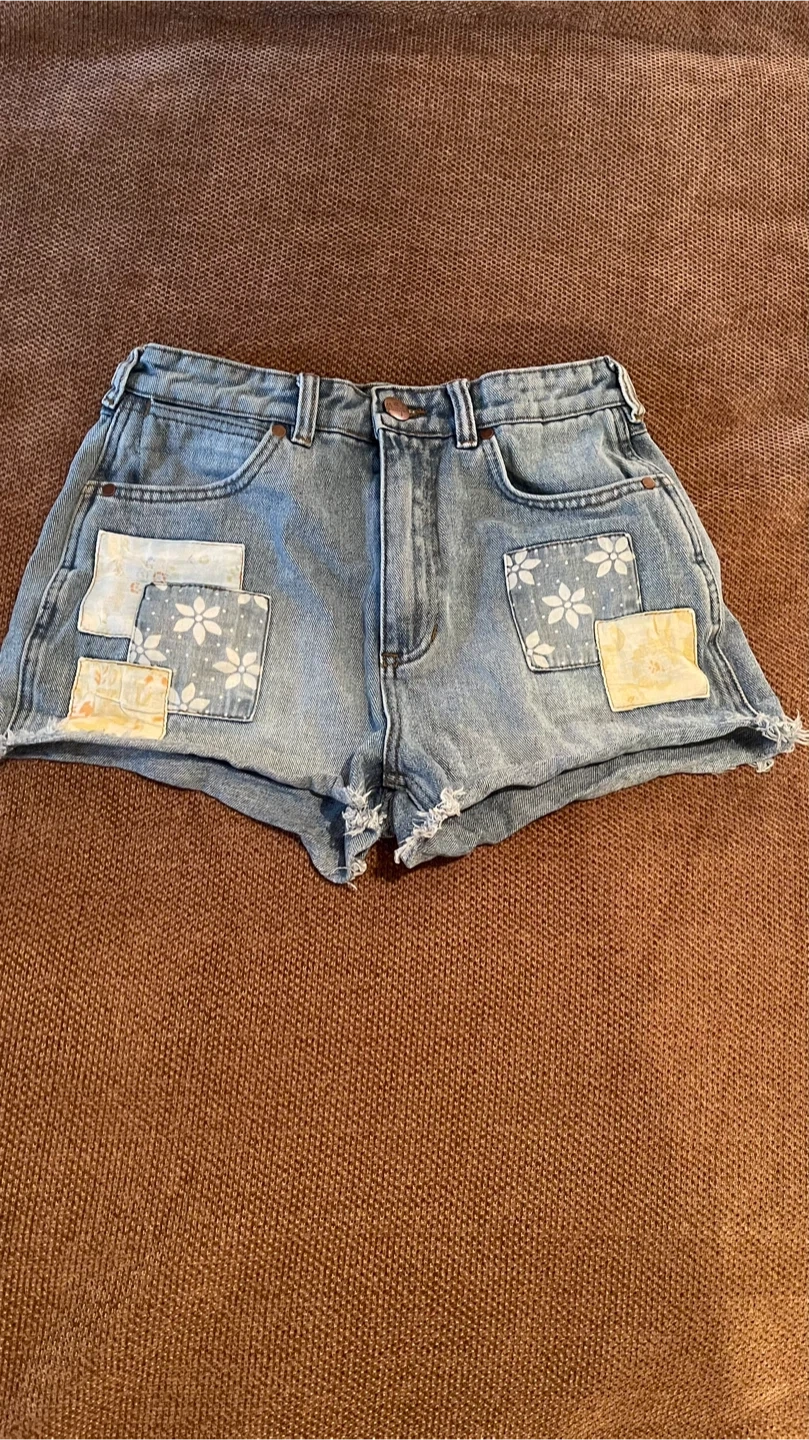 These are light wash denim shorts by Wrangler. They feature patchwork details with floral and plain fabric accents. The leg openings have a distressed, frayed hem.