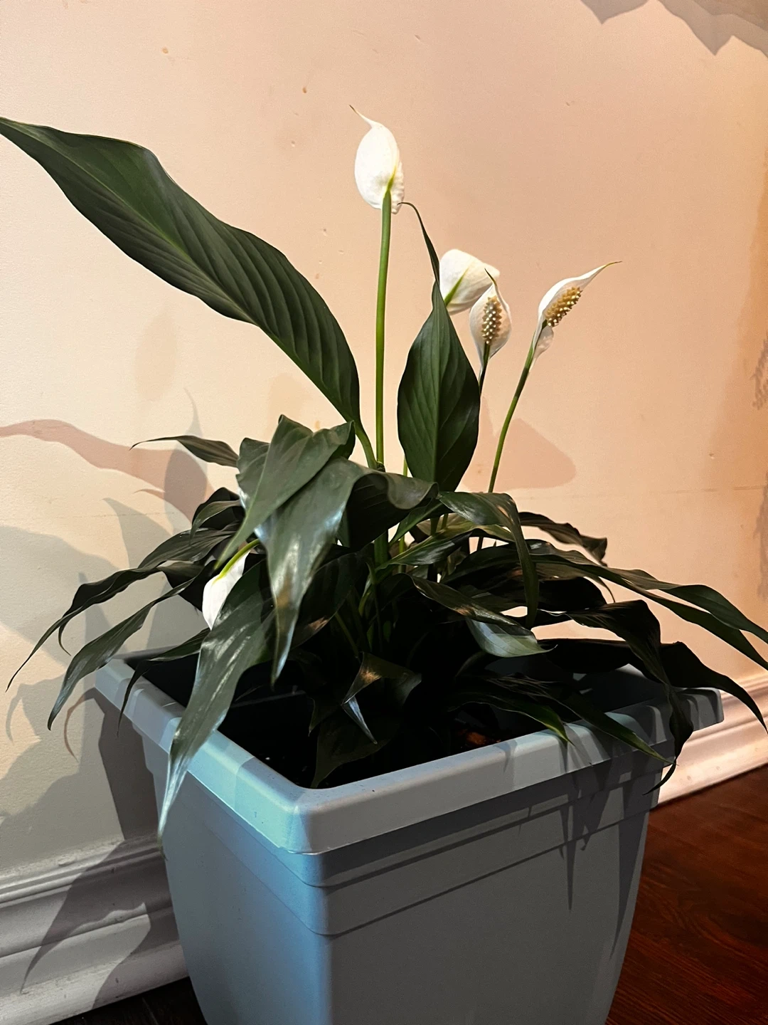 Beautiful Peace Lily plant with white blooms and dark green foliage. Comes in a light grey square planter. This plant's elegant white flowers are a lovely addition to any room!