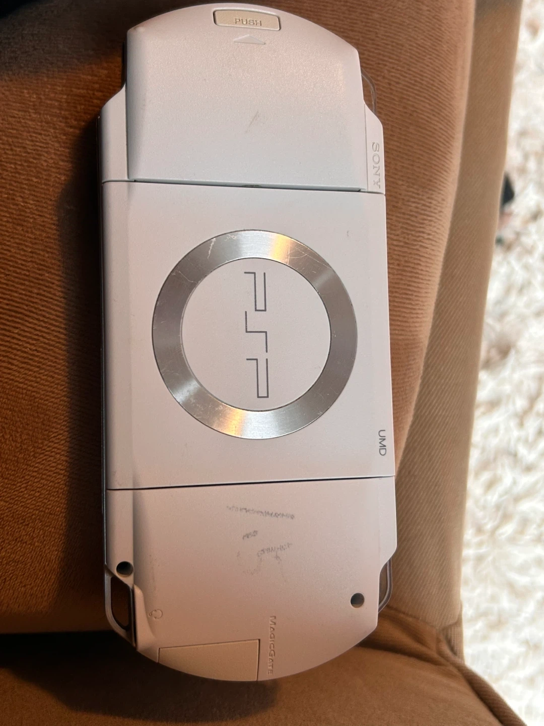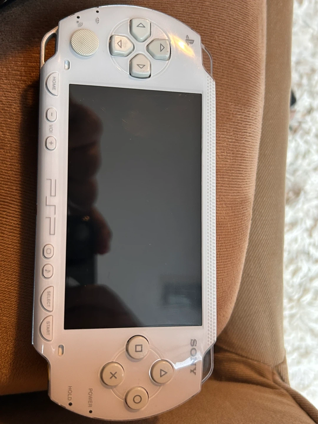 White Sony PSP 3000 handheld gaming console. It's a portable PlayStation Portable system. Includes charger and a memory stick. With modded games included