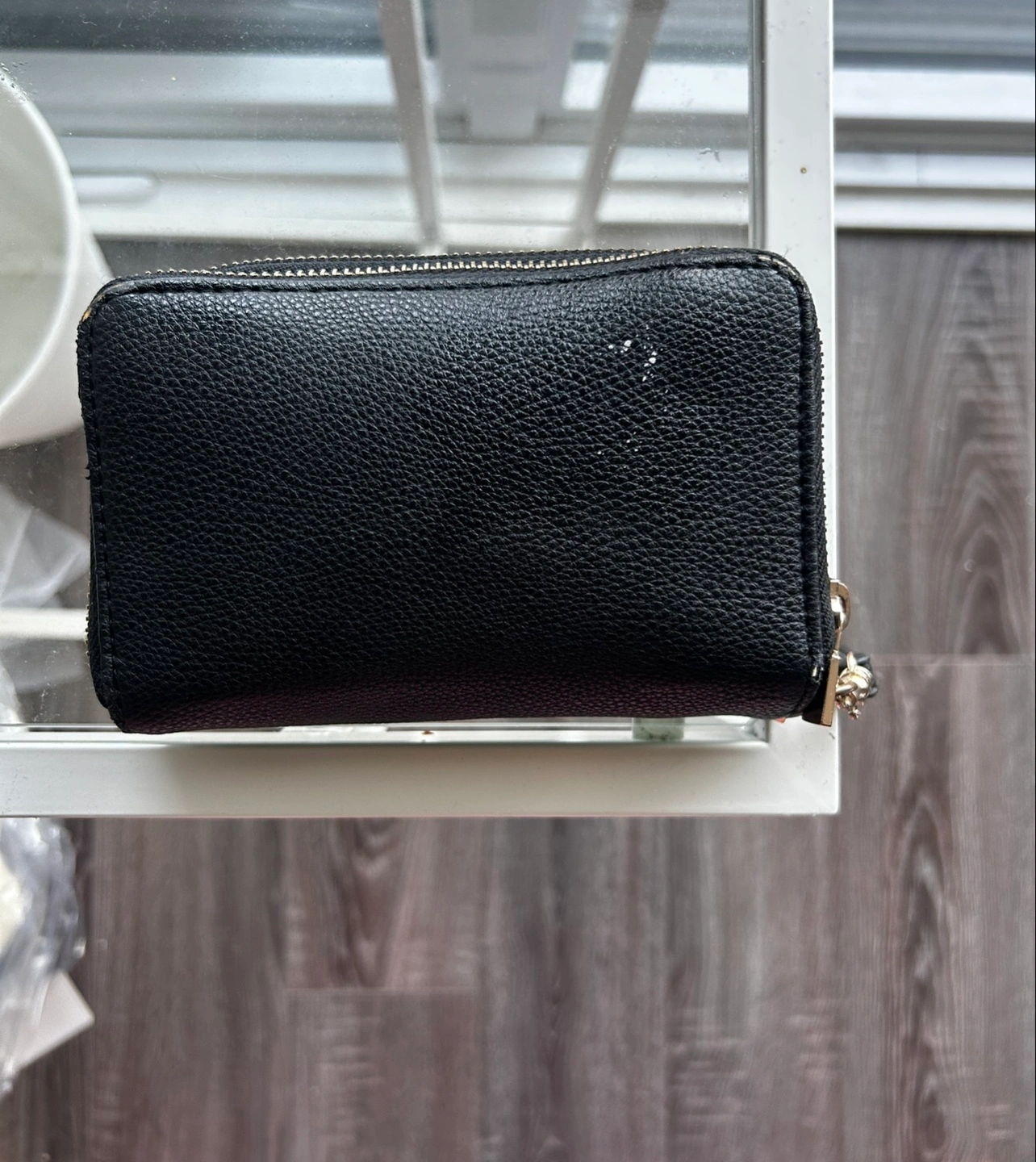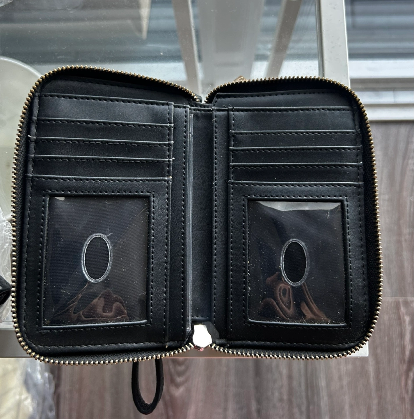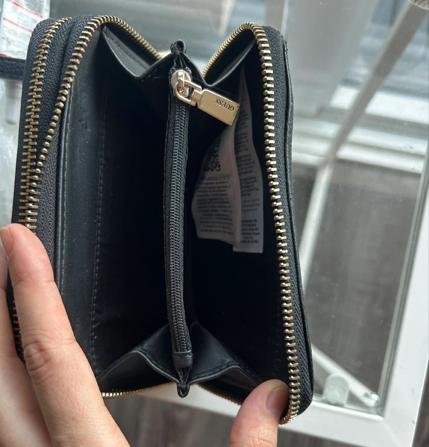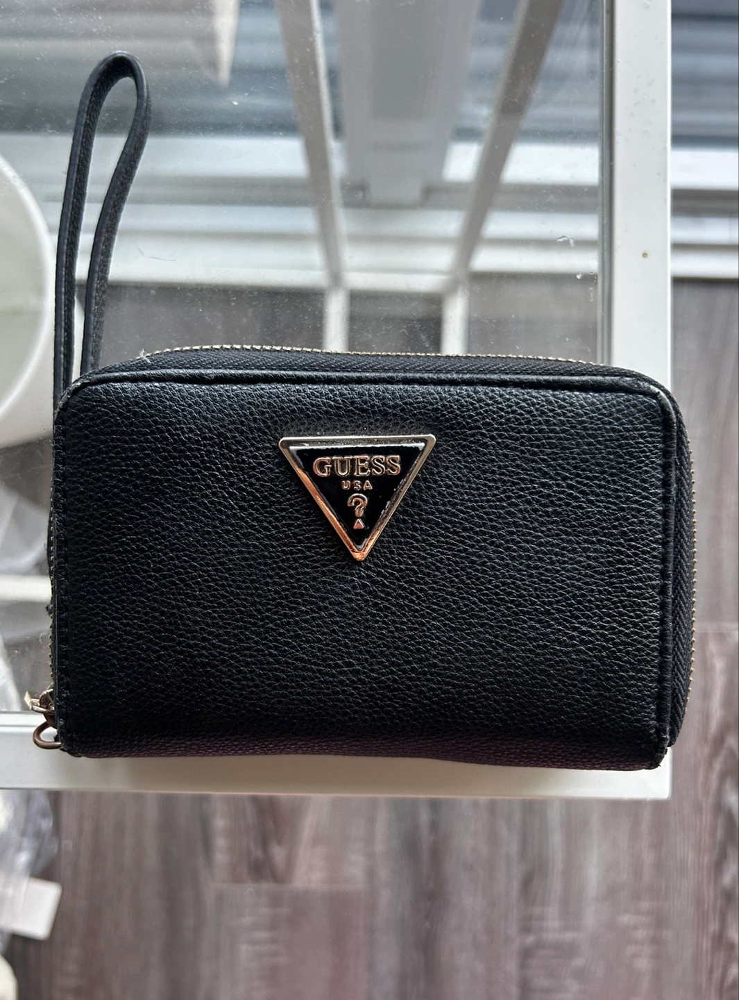 Black Guess wallet. Has a zipper closure. Features a wrist strap. Inside, it has multiple card slots and clear ID windows. You can keep your essentials organized with this wallet, perfect for your day-to-day life.
